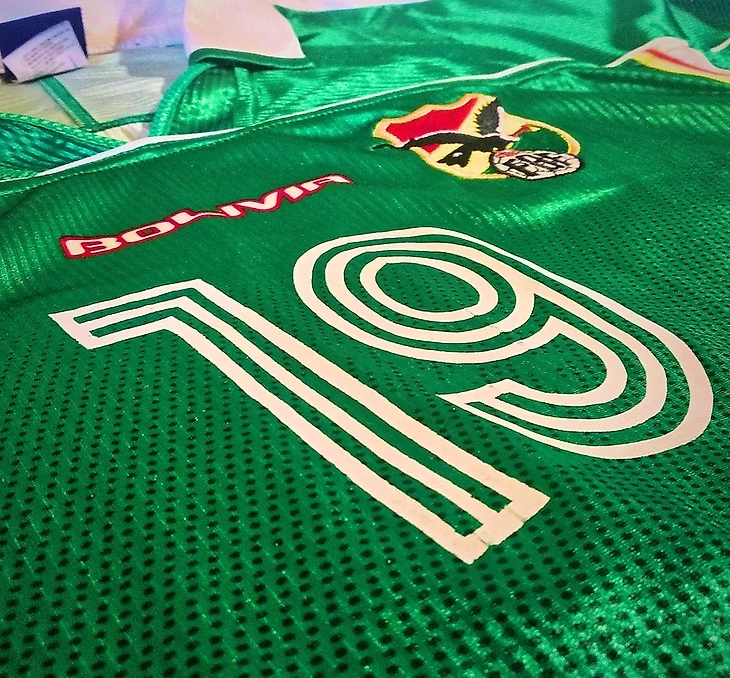 Лого сборной вышито, а номера на спине и груди выполнены термотрансфером. Необычный производитель предложил нестандартный крой футболки с подшитыми по бокам полосками в цветах флага Боливии. Бирка производителя нашита прямо на передней части футболки, а также дополнительная маленькая бирка сбоку.