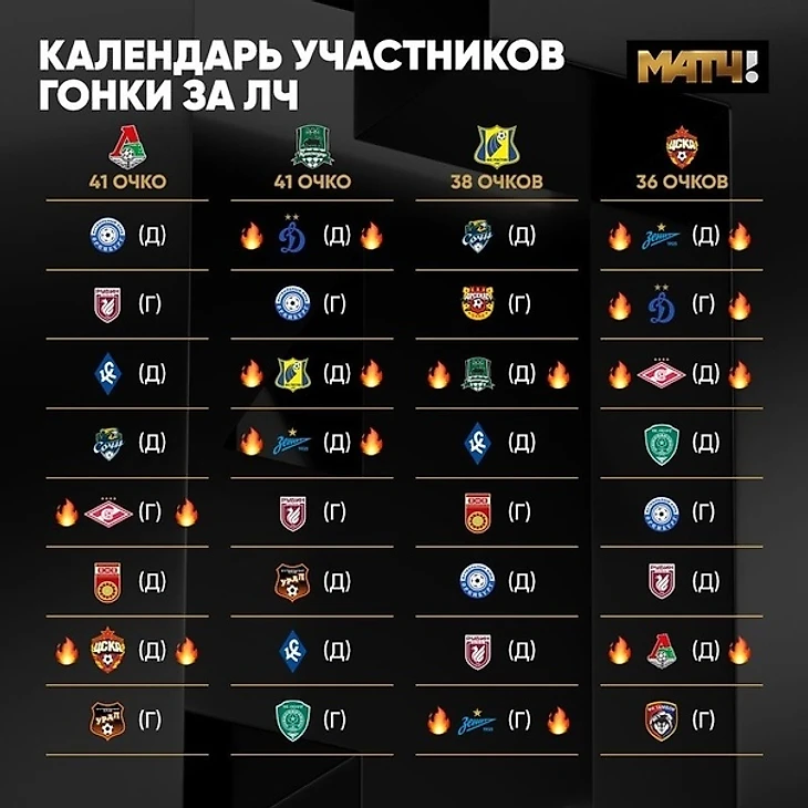 Краснодар имеет средний по сложности календарь. В первом матче они сыграют с Динамо (у Динамо не будет Комличенко и Филиппа, если первый ещё не стал ключевым игроком для Динамо, то потеря второго может сказаться), во втором с Оренбургом (который предложил своему лучшему бомбардиру поиграть бесплатно, на что получил логичный отказ, таким образом они будут играть без него, да и вообще Оренбург не против вылететь), дальше они сыграют с Ростовым и Зенитом, а последние четыре игры с Рубином, Уралом, Крыльями и с Ахматом.