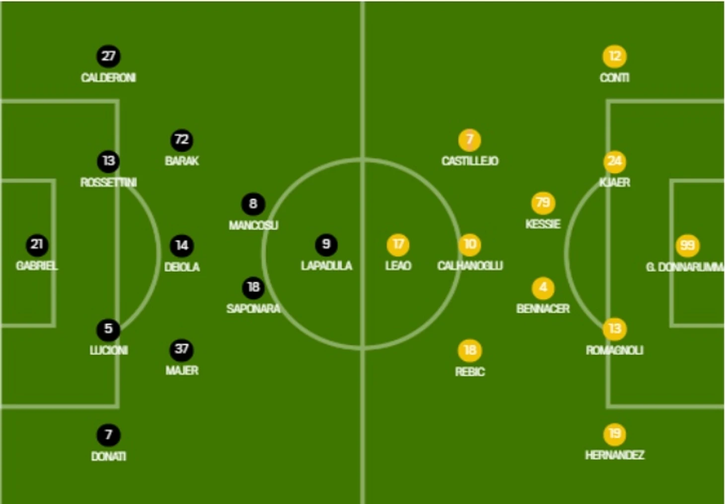 Как уже упоминалось ранее, в строй возвращаются Тео Эрнандес и Самуэль Кастильехо, которые заменят Давиде Калабрию и Лукаса Пакета, сыгравших против "Юве". Неожиданными решениями могут стать перевод Ребича на его привычную позицию левого вингера (ранее утверждалось, что он вновь начнет игру как центрфорвард), и предоставление роли наконечника Рафаэлю Леау, ранее лишенному стартового состава в кубковом матче из-за лени на тренировках.