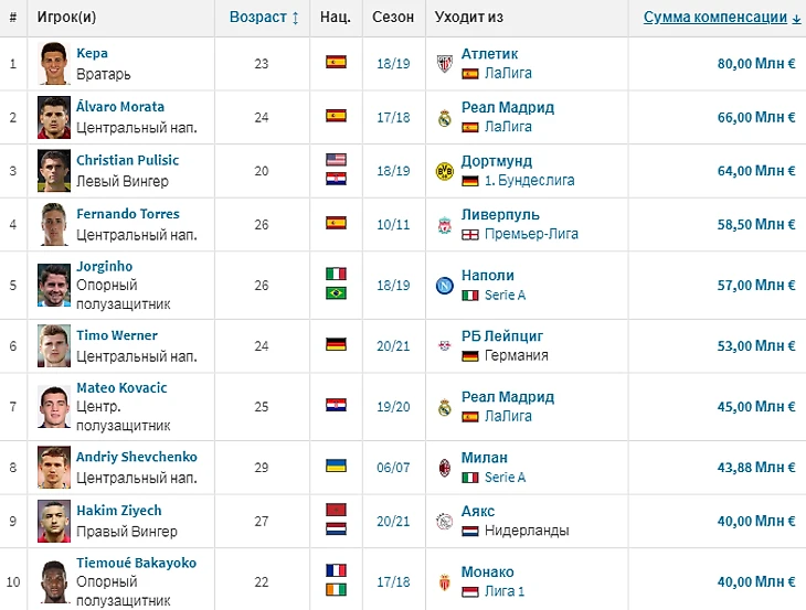 А вот ТОП-10 самых дорогих трансферов в истории Челси. Первое место занимает Кепа Аррисабалага, который пополнил состав "аристократов летом 2018 за € 80 миллионов. В общей сложности "Челси" потратил на этих 10 футболистов чуть более полмиллиарда евро.