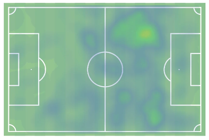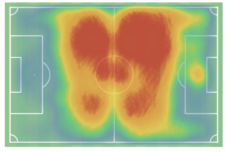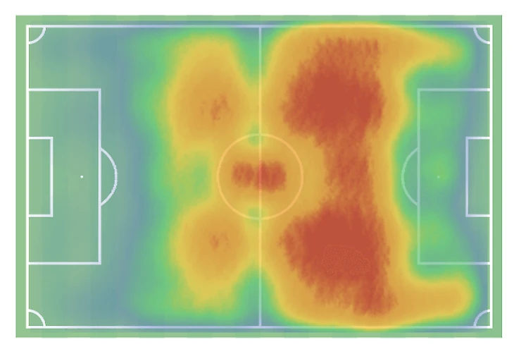 Тепловая карта всей карьеры Фернандеша, примечательная своей симметрией, показывает, что он любит находиться на широком пространстве в поисках возможностей для атаки.