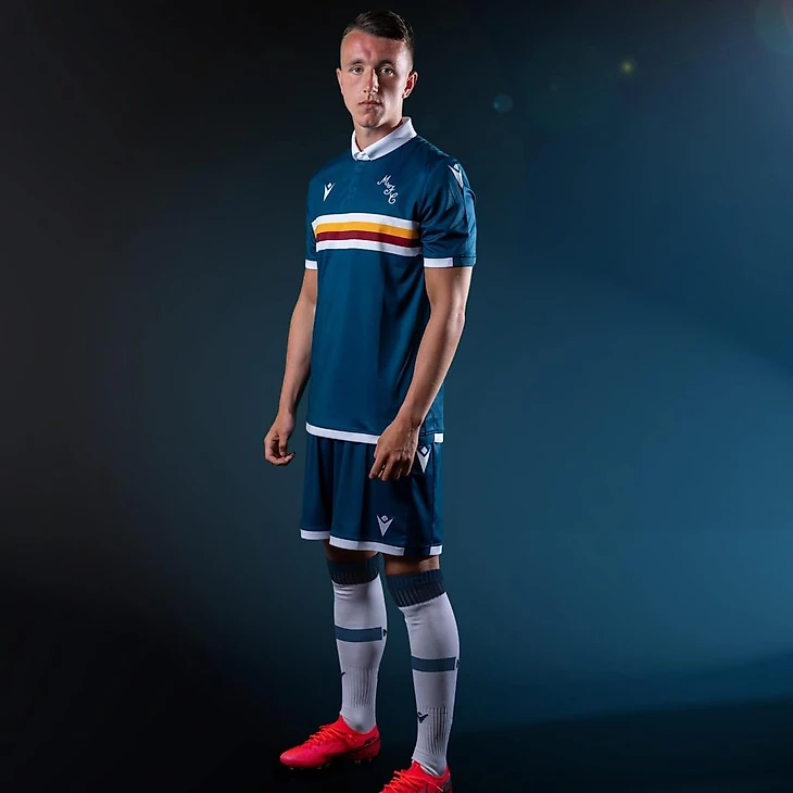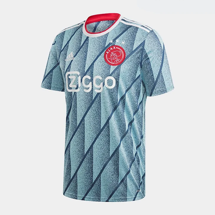 Выездная форма в основном имеет «ледяной синий цвет» (так его именует Adidas). Полосы на плечах и воротник - белый. Воротник окантован красной полоской. Эмблема клуба выполнена в обратных цветах и имеет преимущественно красный цвет с белым рисунком. Графический узор, покрывающий футболку, не является уникальным. Например, такой же узор мы видели на гостевой форме сборной Шотландии 2020.