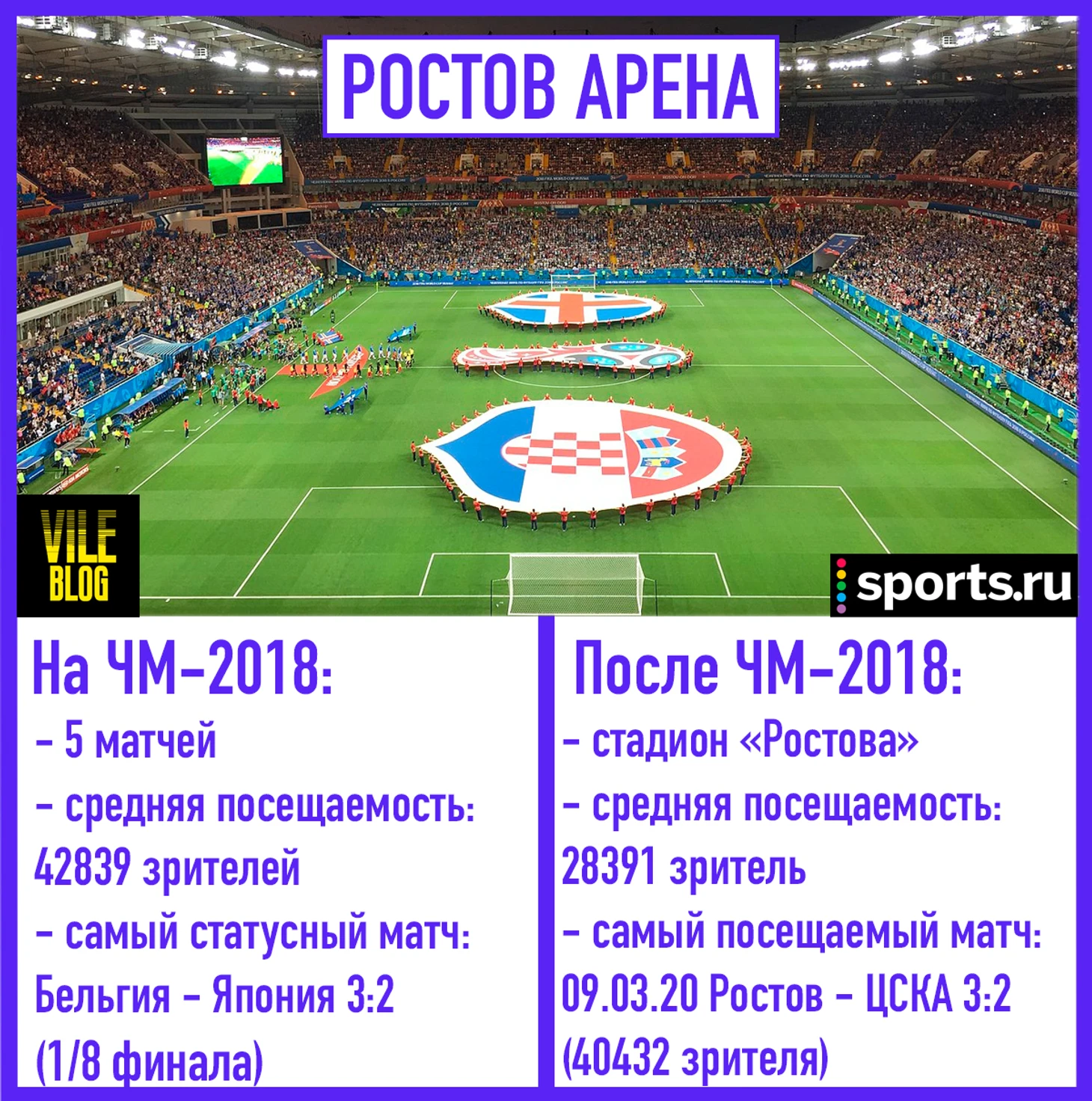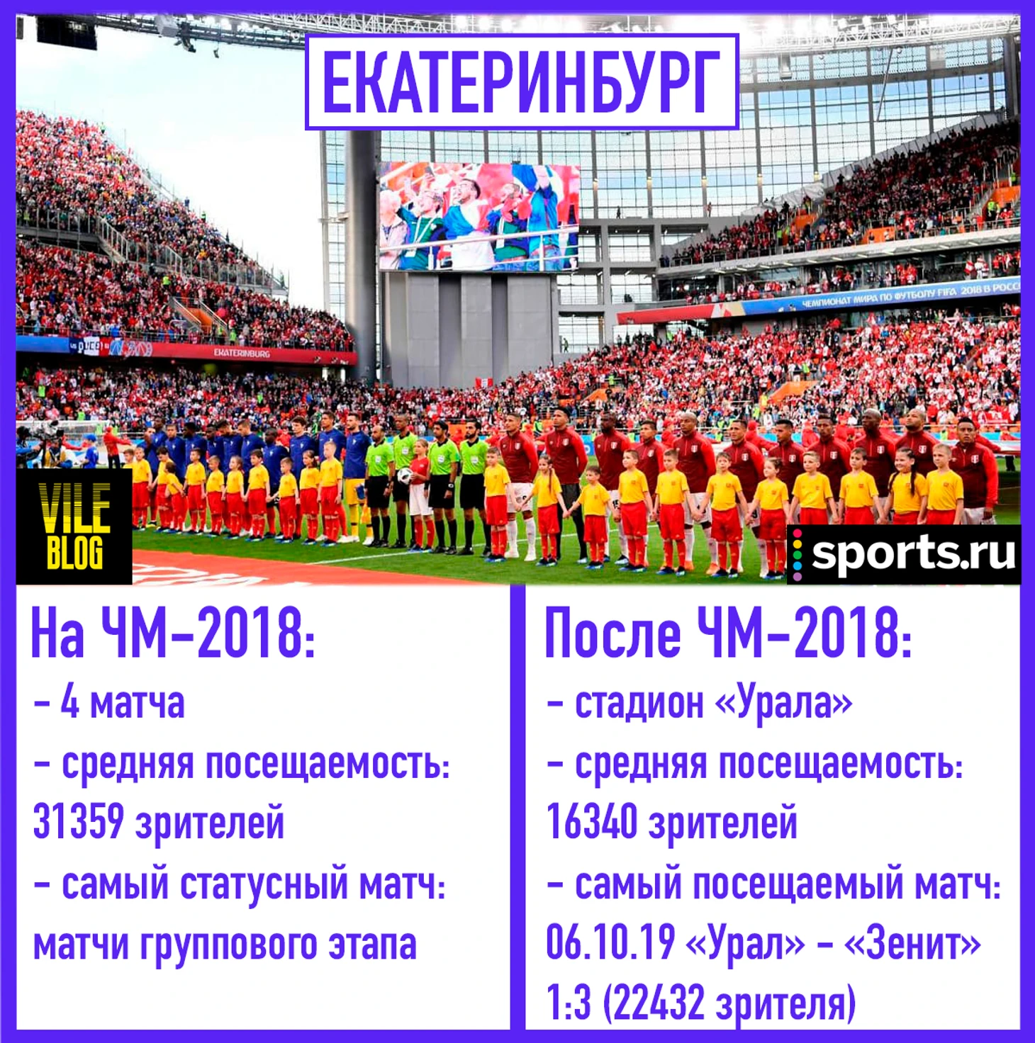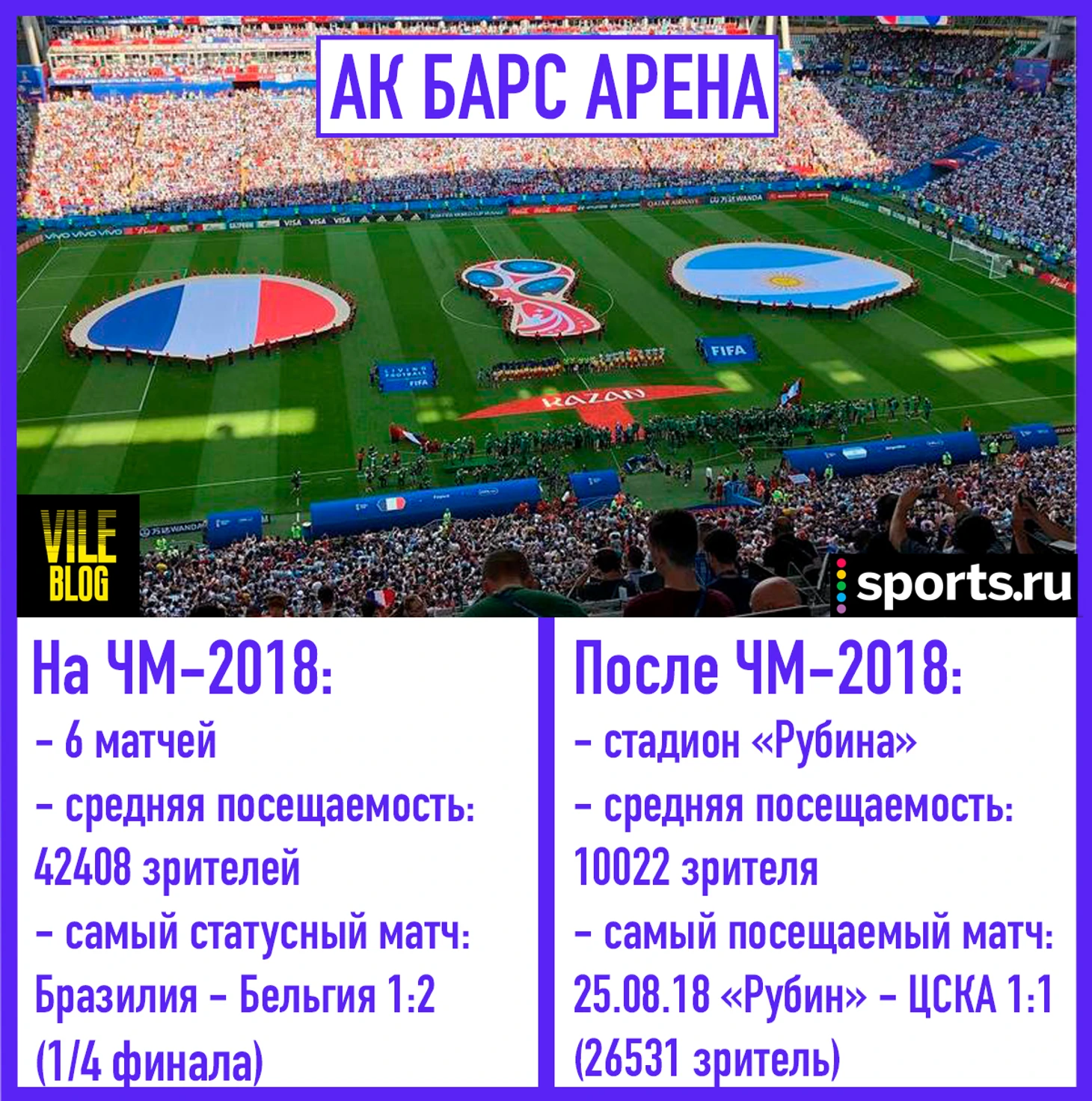 6 матчей Чемпионата Мира. В Казань приезжали сборные Бельгии, Бразилии, Германии, Франции, Аргентины, Испании… Что еще можно желать для популяризации футбола! Но все пошло не так: приведенная средняя посещаемость в инфографике приведена по одному (ОДНОМУ!) матчу, который «Рубин» в этом сезоне сыграл на «Ак Барс Арене». Чемпионаты по водным видам спорта, по профессиям (что?) и многие другие мероприятия, но не футбол. Однако, футбол на арене еще состоится, да еще какой: в 2023 году Казань примет Суперкубок УЕФА. Вторая хорошая новость: домашние матчи этого сезона «Рубин» тоже должен доиграть на «Ак Барс Арене».
