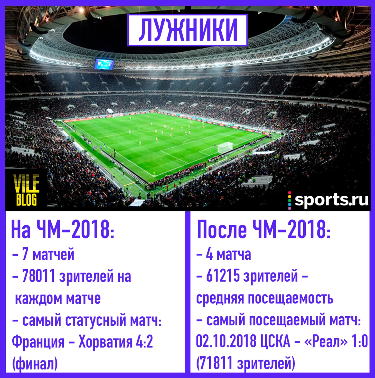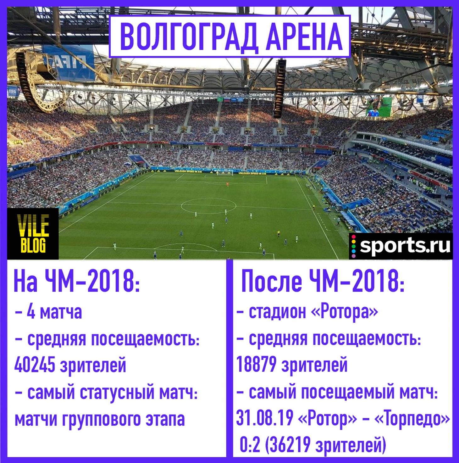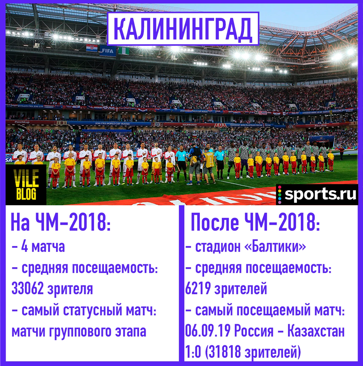 6 матчей Чемпионата Мира. В Казань приезжали сборные Бельгии, Бразилии, Германии, Франции, Аргентины, Испании… Что еще можно желать для популяризации футбола! Но все пошло не так: приведенная средняя посещаемость в инфографике приведена по одному (ОДНОМУ!) матчу, который «Рубин» в этом сезоне сыграл на «Ак Барс Арене». Чемпионаты по водным видам спорта, по профессиям (что?) и многие другие мероприятия, но не футбол. Однако, футбол на арене еще состоится, да еще какой: в 2023 году Казань примет Суперкубок УЕФА. Вторая хорошая новость: домашние матчи этого сезона «Рубин» тоже должен доиграть на «Ак Барс Арене».
