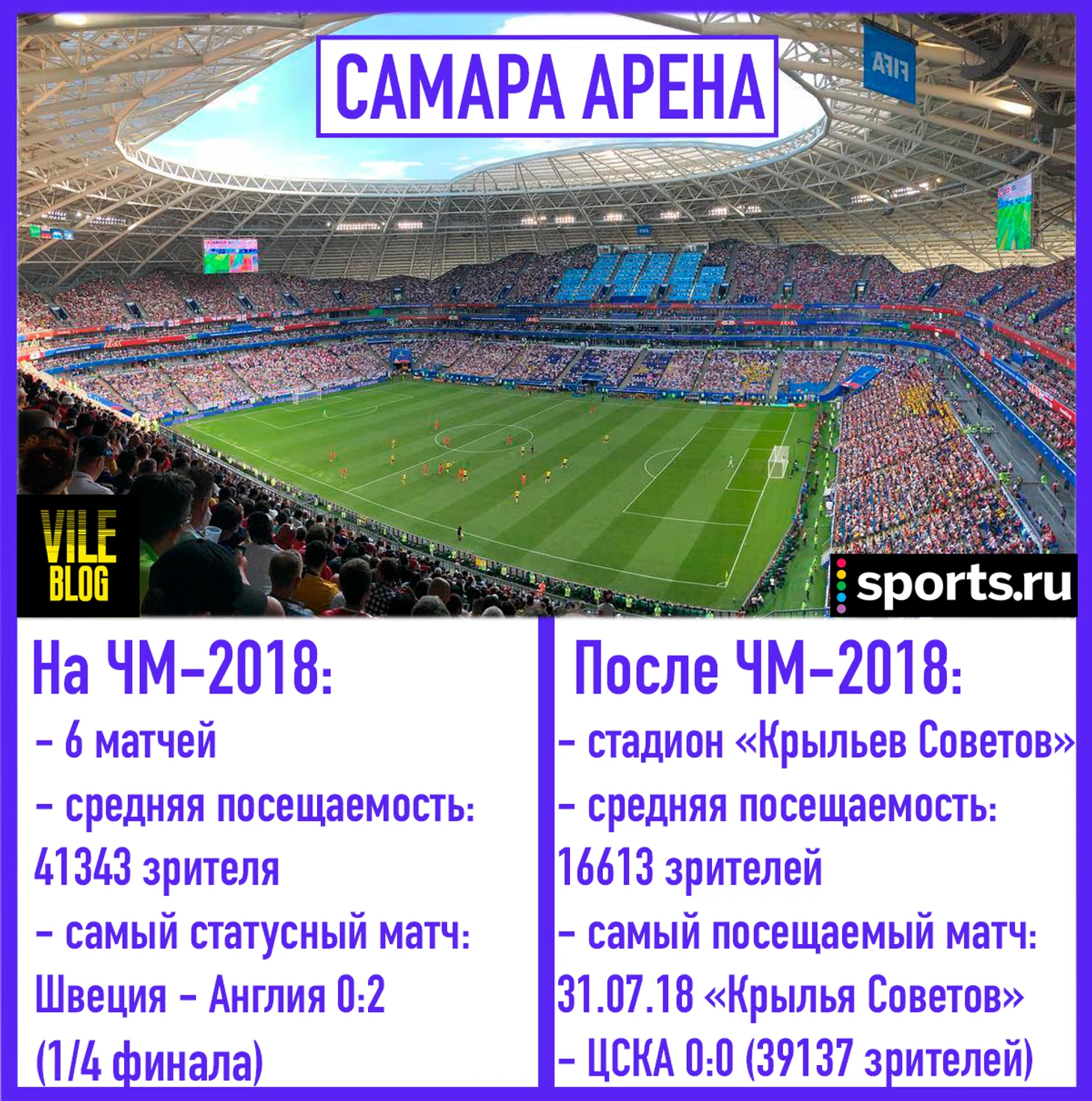 В Самаре состоялся, пожалуй, худший матч сборной Росси на Чемпионате Мира (разгром от Уругвая 0:3), однако сам город здесь ни при чем. После мундиаля на арене играют «Крылья Советов», и есть большой риск, что в следующем сезоне посещаемость сильно снизится: «Крылья» на данный момент замыкают турнирную таблицу чемпионата России. Пока же посещаемость составляет больше 16 тысяч - не так много, как хотелось бы, но гораздо больше, чем во времена ранних десятых.