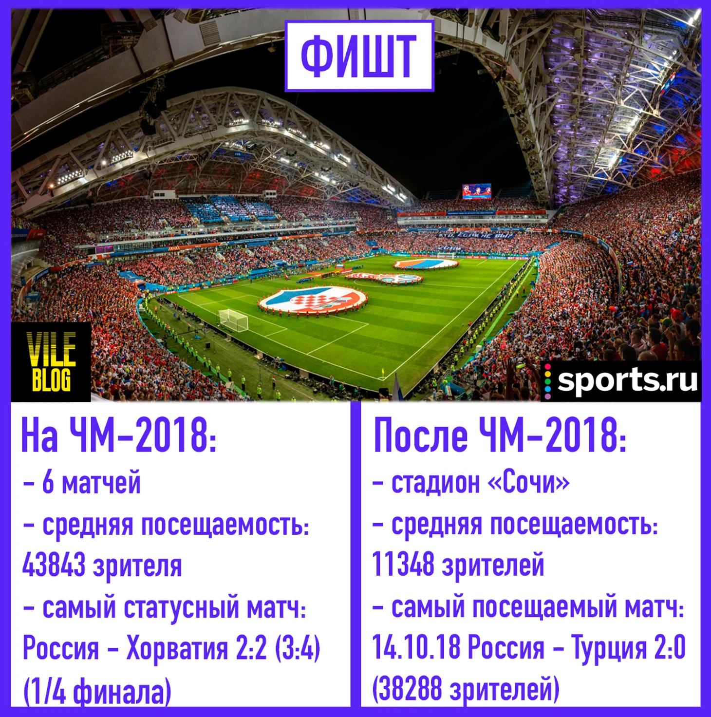 В Сочи прошел последний матч сборной России на мундиале: феерические 2:2 с Хорватией, гол Фернандеса в овертайме, паненка Смолова в серии пенальти… Именно здесь закончилась сказка нашей сборной. После чемпионата заканчивается и сказка стадиона: на матчах местной команды редко приходит больше 10 тысяч зрителей даже в РПЛ (в ФНЛ средняя посещаемость была и вовсе 3770 зрителей). При этом стоит отметить, что Сочи - город курорт, там и зимой, и летом отдыхает огромное количество наших соотечественников. При достойных рекламе, активностях вокруг матча, качественном СММ клуба поединки вполне могли бы собирать гораздо больше зрителей, ведь это было бы великолепным способом провести вечер - удобное расположение стадиона позволяет совместить посещение матча с прогулкой по Олимпийскому парку, который ни пустует ни дня.