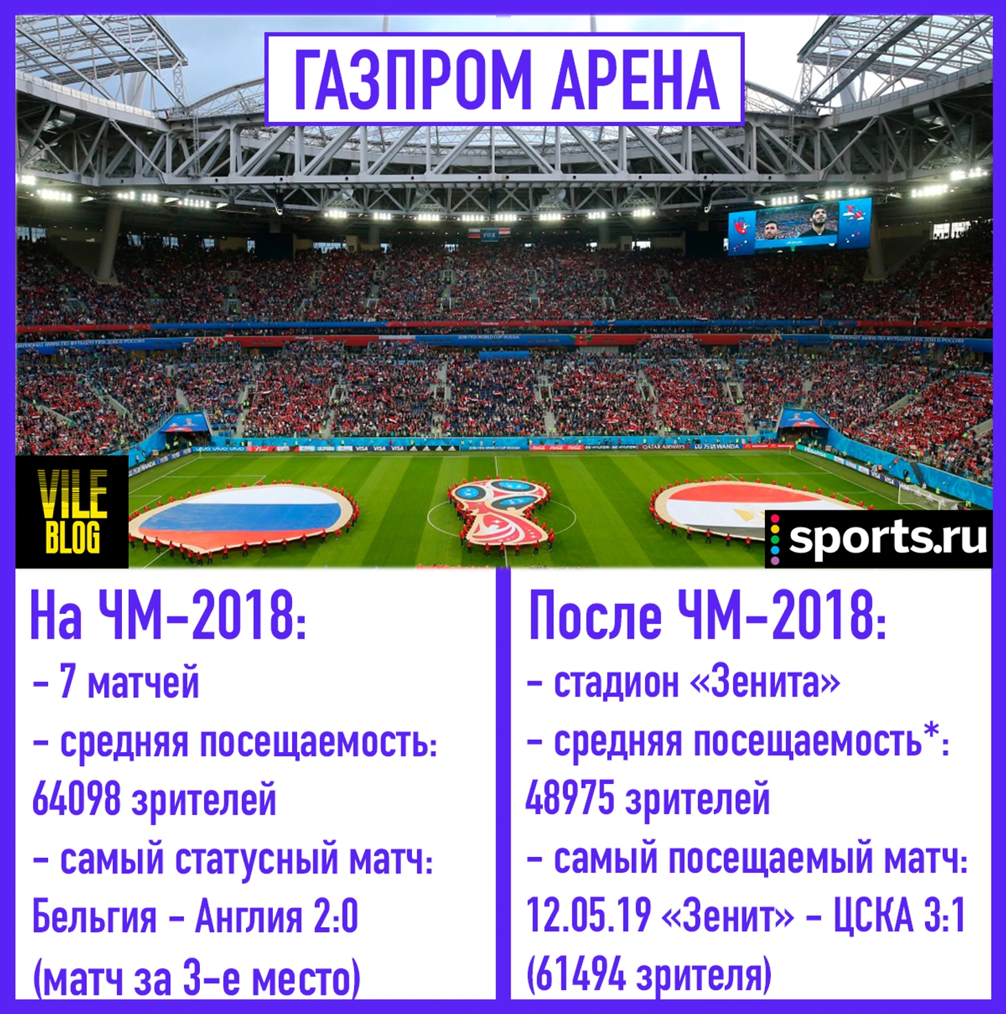 Санкт-Петербург принимал 7 матчей чемпионата, среди которых полуфинал между Бельгией и Францией, а также матч за третье место, в котором те же бельгийцы противостояли сборной Англии (кстати, в ноябре 2019 года бельгийцы вернулись в Петербург: на этот раз 53 тысячи зрителей смогли увидеть победу Бельгии уже над нашей сборной). После мундиаля стадион продолжает регулярно привлекать зрителя: посещаемость матчей «Зенита» самая высокая в чемпионате, арена примет матчи ближайшего Чемпионата Европы, а также финал Лиги Чемпионов в 2022 году. Уже как-то и неловко вспоминать шутки про бакланов, «распил-арену» и так далее: стадион превратился в одно из любимых мест отдыха петербуржцев, ведь помимо самого футбола команда «Зенита» организовывает вполне прекрасный matchday.