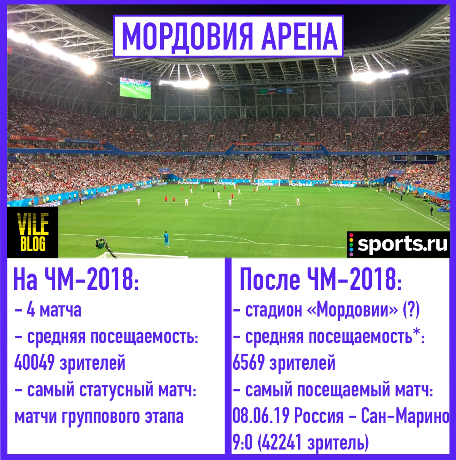 Саранск принял четыре матча группового этапа, вишенкой среди которых стал матч Панама - Тунис (сарказм). Самое интересное началось уже после турнира: в сезоне 2018/19 «Мордовия Арена» была домашним стадионом «Мордовии», в первой половине сезона 2019/20 на арене играл «Тамбов», а после зимнего перерыва домашние поединки на стадионе провели та же «Мордовия» и нижнекамский «Нефтехимик». При этом нельзя отметить особого интереса у местной публики ни к одной из этих команд. Зато национальную сборную в Саранске встречают достойно: помимо аншлага на матче с Сан-Марино, была зафиксирована достойная посещаемость (больше 28 тысяч) и на матче молодежки со сверстниками из Сербии. Пока не понятно, зачем было возводить стадион именно в Саранске - футбольного бума здесь так и не случилось.