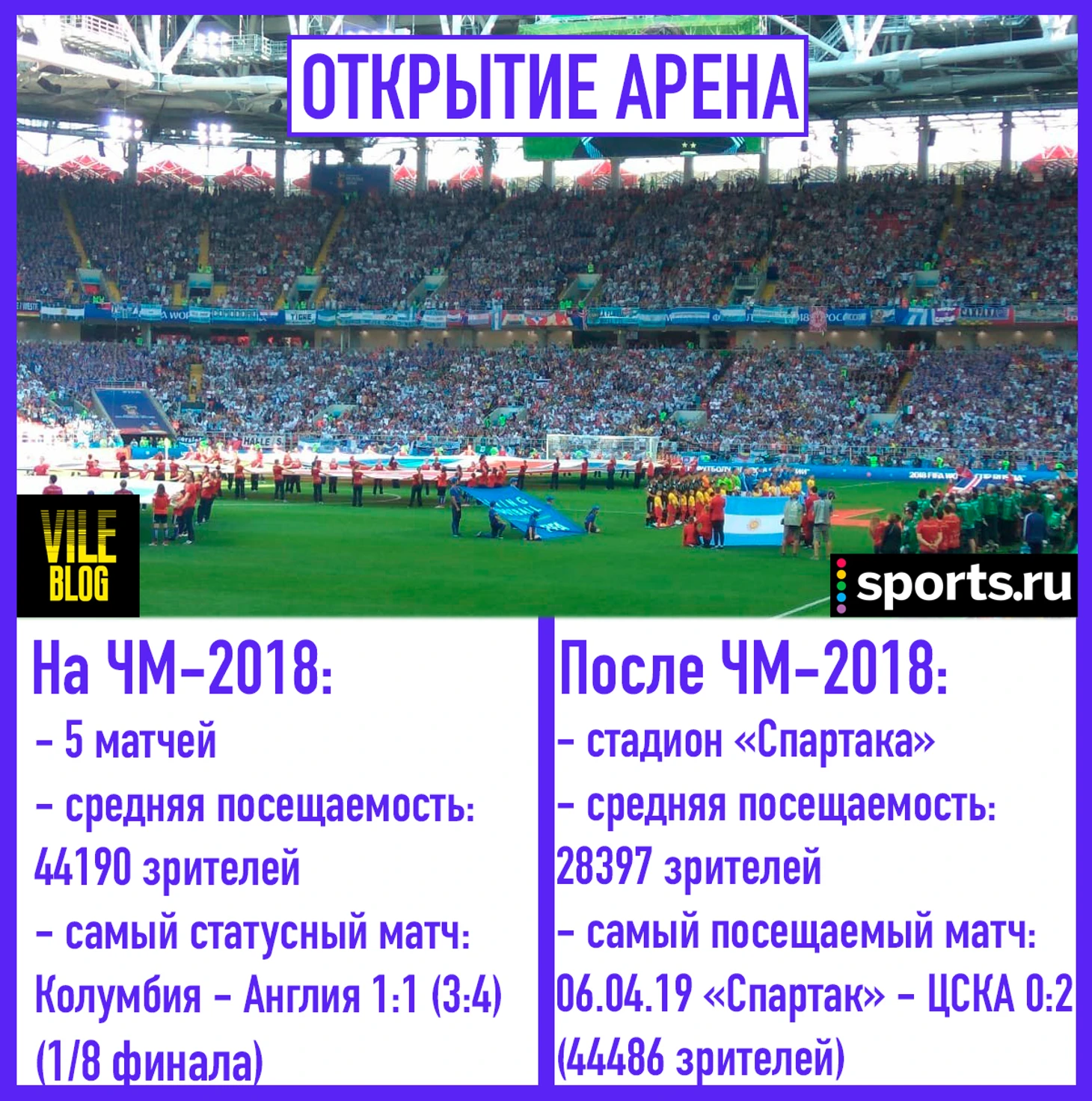 Так как стадион «Спартак» был вторым представителем Москвы на мундиале, то последним матчем чемпионата, сыгранным в Тушино, стала битва Колумбии и Англии на стадии 1/8 финала. Стоит отметить, что «Спартак», как и «Лужники», на всех своих матчах собрал аншлаги (в том числе и на матче Польша - Сенегал). После Чемпионата Мира на стадион продолжают ходить болельщики - «Спартак» не зря называют «народной командой» и самой популярной командой России (мои извинения ВЦИОМ и «Зениту»). В последнее время посещаемость снизилась - сказалось недовольство болельщиков политикой руководства (читай «расставанием с Каррерой»), однако на матчах с ЦСКА, «Зенитом» и «Динамо» стадион обычно под завязку.
