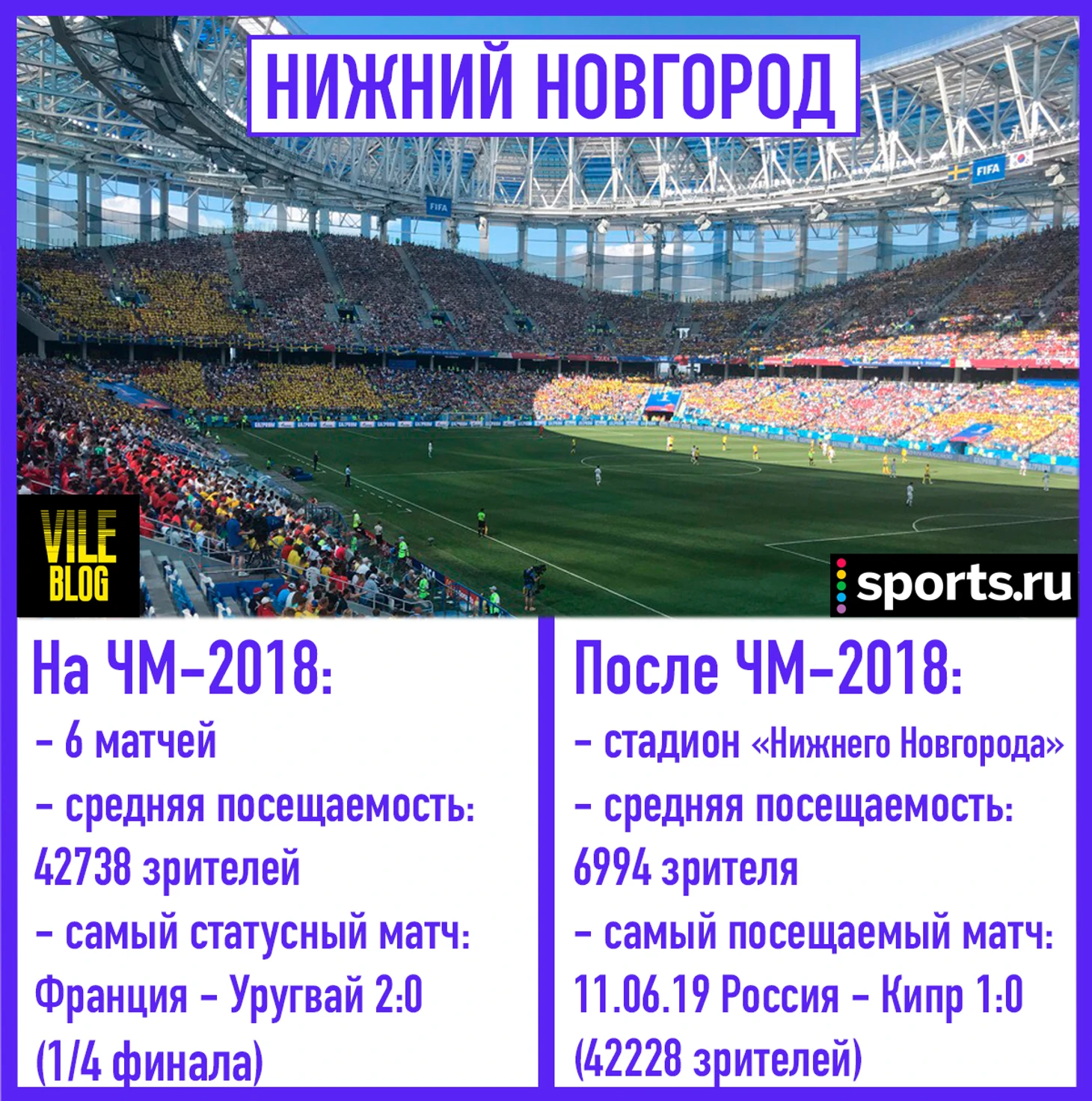 В Нижнем Новгороде прошло 6 матчей мундиаля, в том числе четвертьфинал Франция - Уругвай. Самая знаменитая история во время Чемпионата Мира, связанная с этим городом, получилась комичной: фанаты сборной Аргентины перепутали Нижний Новгород с Великим и не увидели поражение родной сборной от хорватов. Зато стали местными звездами и даже посмотрели местный кремль. После мирового первенства посещаемость стадиона упала значительно: хоть в текущем сезоне «Нижний Новгород» и вторая команда ФНЛ по посещаемости, стадион в среднем не заполняется даже на четверть. Также в Нижний Новгород неожиданно вернулась Премьер-Лига: в 2020-м домашние матчи здесь проводит «Тамбов», правда в матчах до перерыва (их было два) на тамбовских футболистов зрителей ходило даже меньше, чем на местных любимцев публики.
