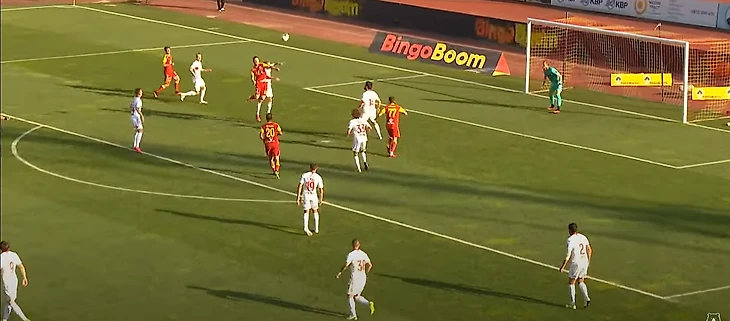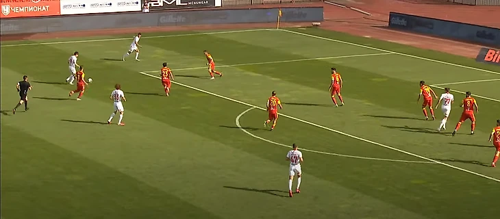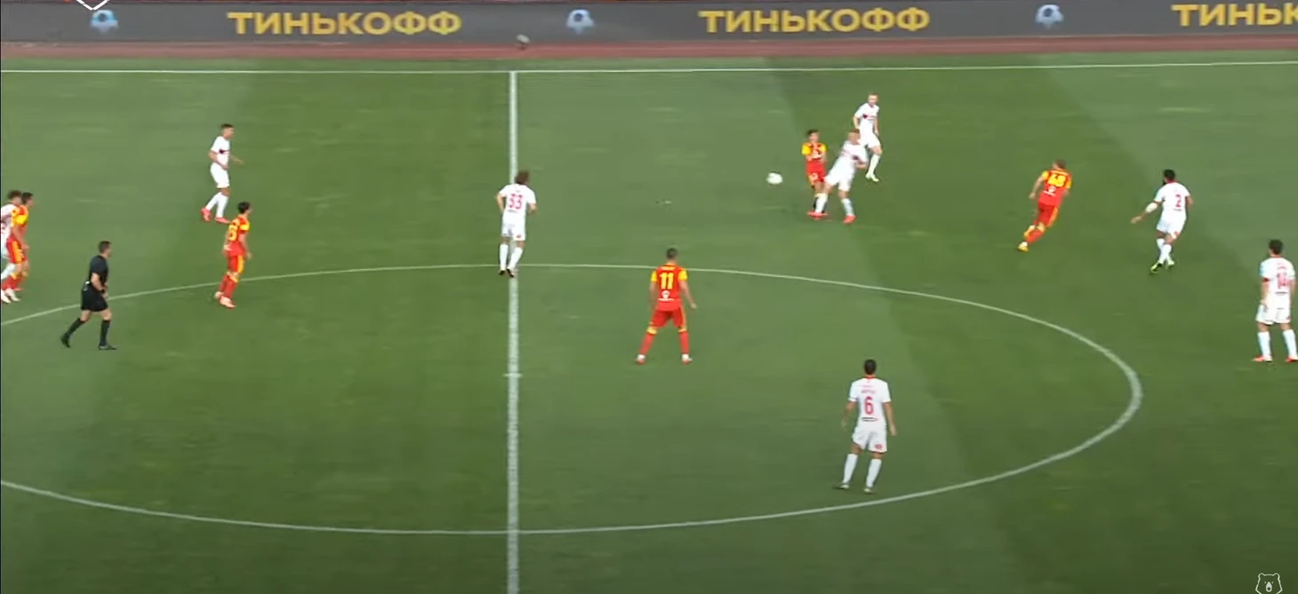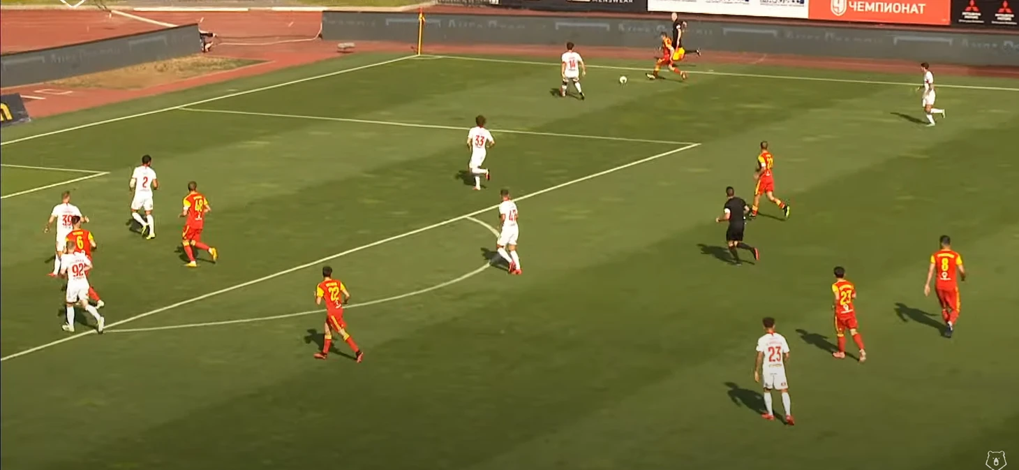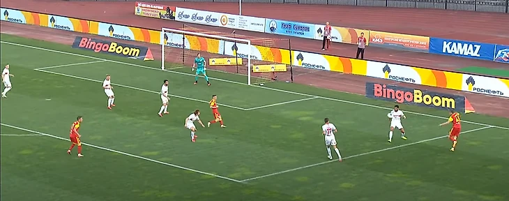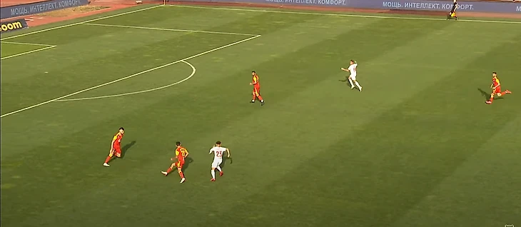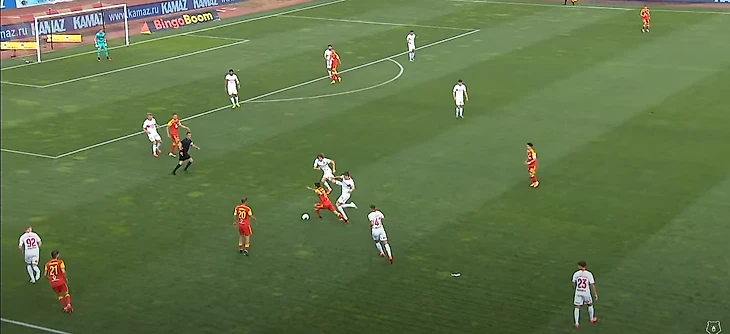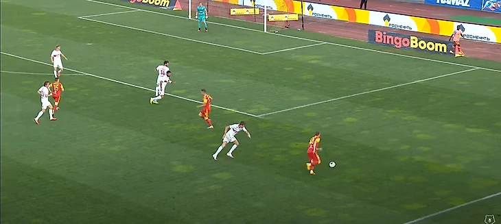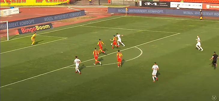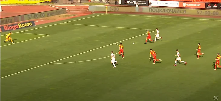 Айртона проходит далеко по флангу и очень неудачно откатывает мяч Бакаеву - Зелимхан не успевает вернуться, и мяч попадает к игроку хозяев