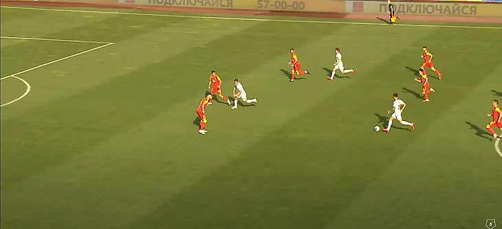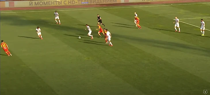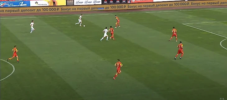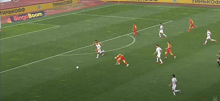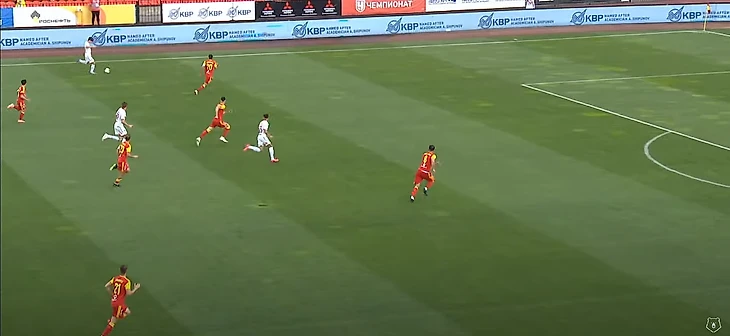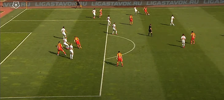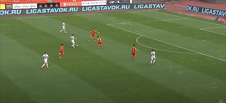 Бакаев проходит по левому флангу, в центре его поддерживают Соболев и Ларсон. Момент заканчивается неточной передачей от Зелимхана