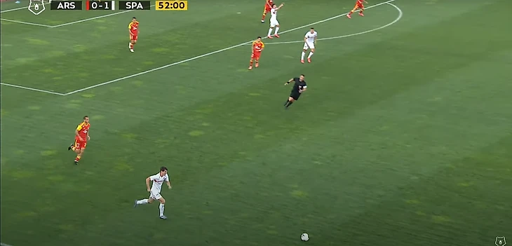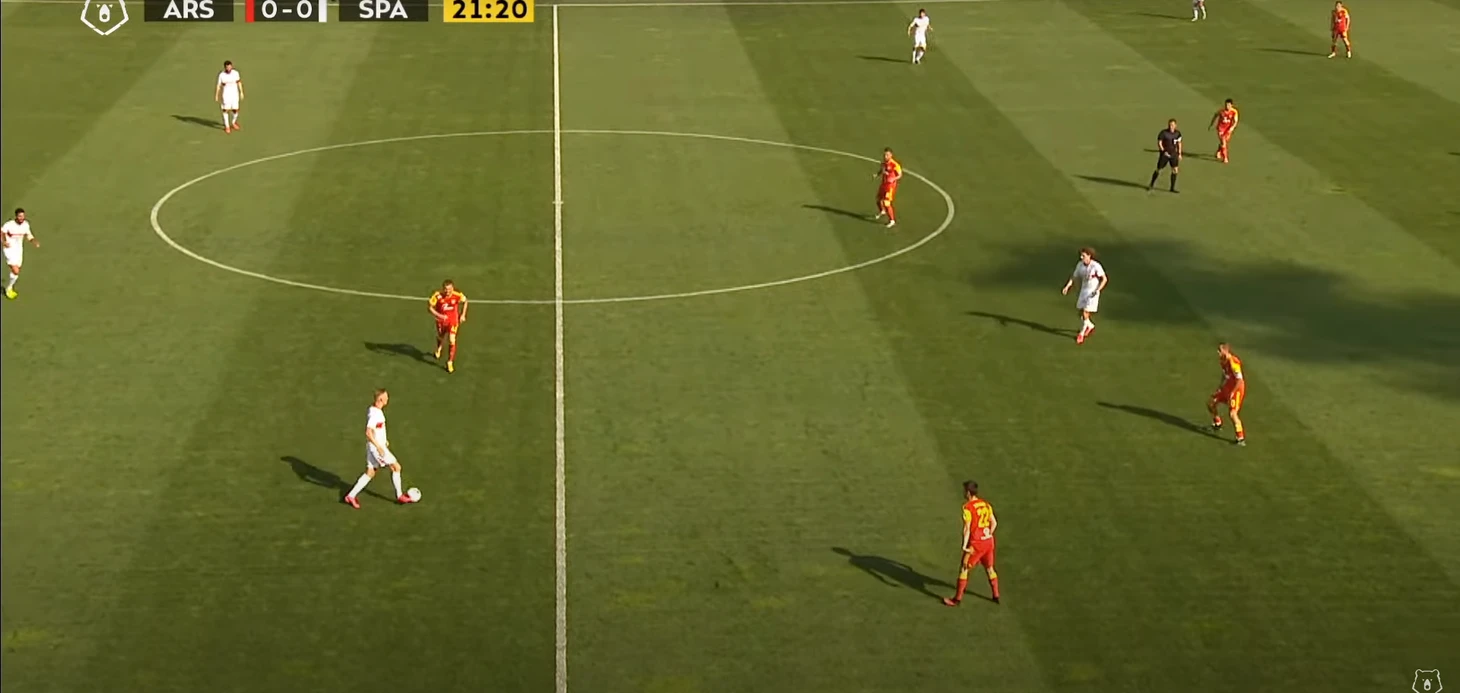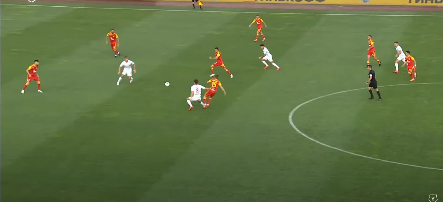 Рассказов отбирает мяч на своем фланге и отдает мяч Зобнину, за линией мяча сразу 7 игроков Арсенала (двое не попали в кадр), перед Романом огромное пустое пространство