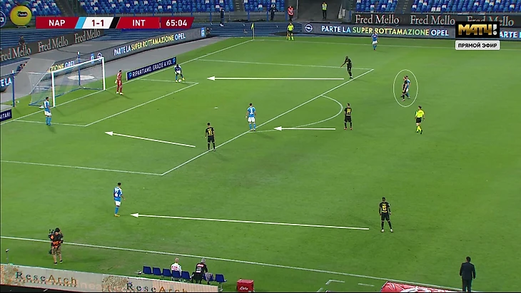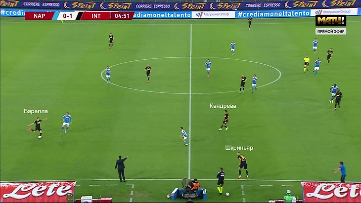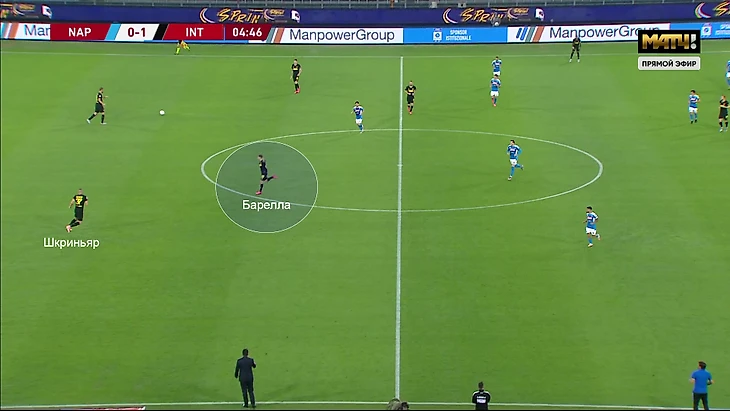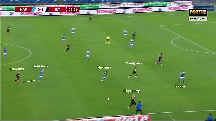 Вот конкретный пример. На Шкриньяра вообще не отреагировали сразу – центральный полузащитник Петр Зелиньски пошел до конца за Бареллой, а вингер Лоренцо Инсинье сузился: