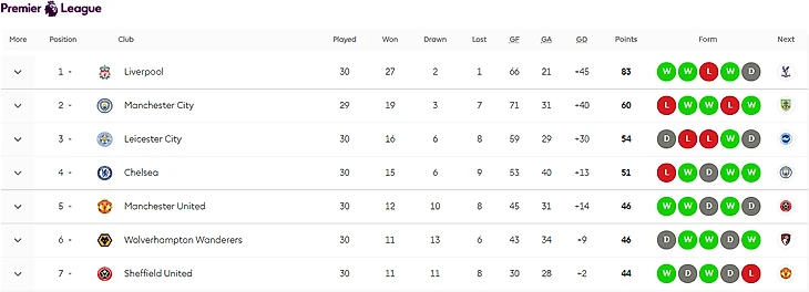 После 30 игр у «Челси» 51 очко – это на 5 больше, чем у МЮ и «Вулверхэмптона», и на 3 меньше, чем у «Лестера». В последнем туре оба конкурента оступились – редкая ситуация, когда «синие» этим воспользовались.