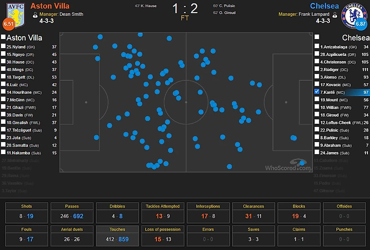 На опорную зону пришлось в лучшем случае 20, все остальное – на границе средней и финальной третей, когда атака уже пошла, «Вилла» прижалась к воротам, и у Канте появилась возможность двинуться выше. Эти касания нельзя отнести к стартовой фазе, за которую Н’Голо был ответственен.