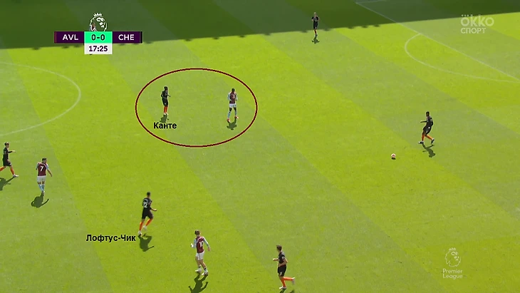 Канте не пытается уйти из-под опеки Дэвиса. Это вынуждает Лофтус-Чика смещаться глубже и помогать с продвижением мяча.
