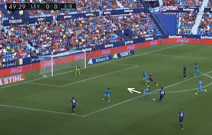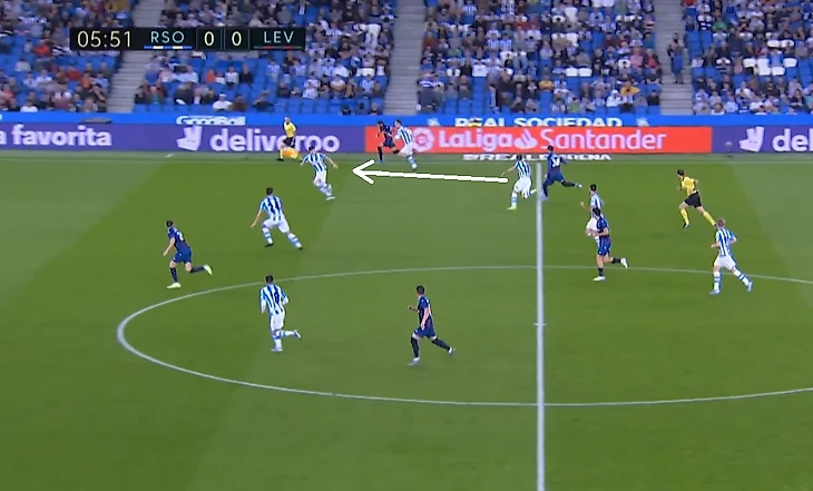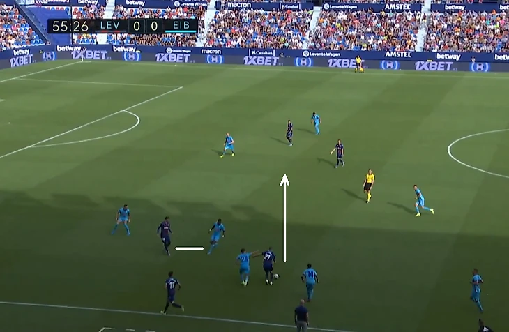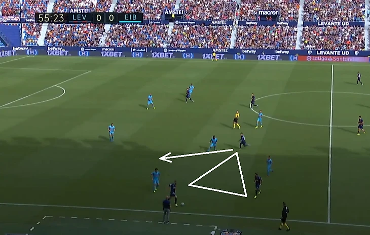 Кампанья в принципе любит подключаться к розыгрышу мяча на фланге. Помимо передач на партнеров, он уводит за собой игрока соперника и открывает зоны для крайнего полузащитника/защитника. Рассмотрим типовой пример в матче против «Эйбара». В игровом эпизоде образовался импровизированный треугольник, благодаря подключению Хосе.
