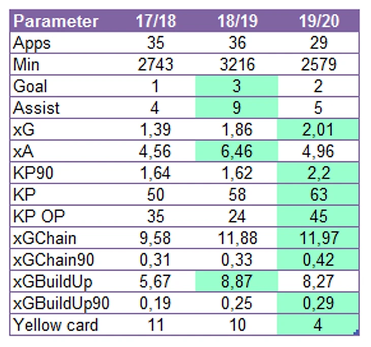 Кампанья лидер «Леванте» в последних двух сезонах по этим показателям, включая xGBuildUp90, что говорит о его высокой значимости в построении атак «лягушек». При этом Хосе стабильно прогрессирует и улучшает качество своей игры. Ниже приведена сравнительная таблица его показателей за последние 3 сезона (включая действующий):
