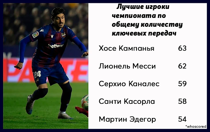 Если проанализировать статистику Ла Лиги по общему количеству ключевых передач, можно удивиться. На первой строчке нет Лионеля Месси. Хотя именно он занимал почетное лидерство по этому показателю уже два сезона подряд. Думаю, что к концу сезона ситуация станет привычной. Особенно в последних матчах, когда Барселоне нужно будет добывать только победы для борьбы за чемпионство. Так произошло мое знакомство с Хосе Кампанья - 27-летним испанским центральным полузащитником «Леванте» под номером 24.