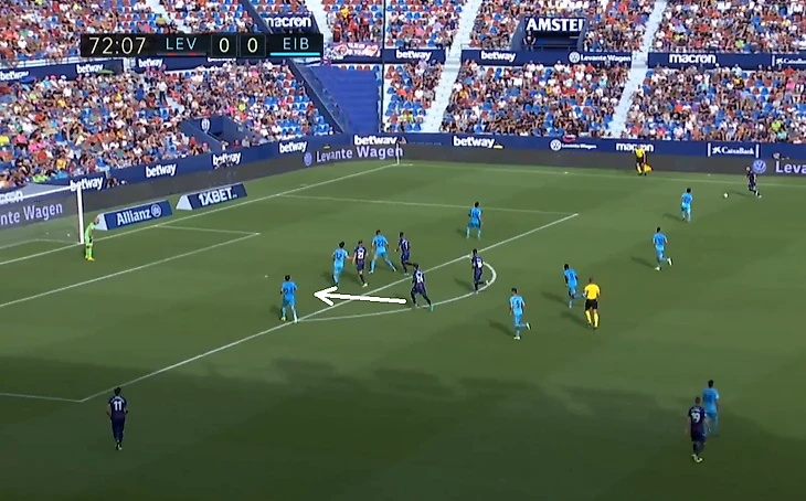 В некоторых эпизодах Кампанья спускается глубже в защиту и оказывает помощь в развитии атаки центральным защитникам, когда они находятся под высоким прессингом соперника. Таких эпизодов мало, так как обычно «Леванте» не разыгрывает мяч так близко к своим воротам. Пример из матча против «Атлетико».