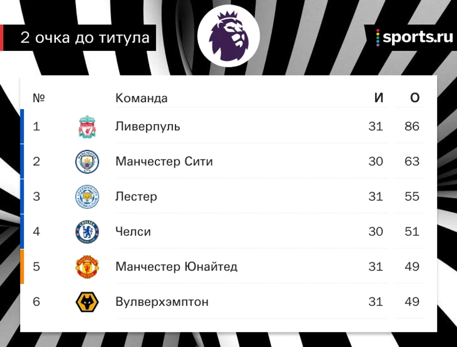 • У «Ливерпуля» 86 очков после 31 тура; «Сити» отстает на 23 очка, но имеет игру в запасе.