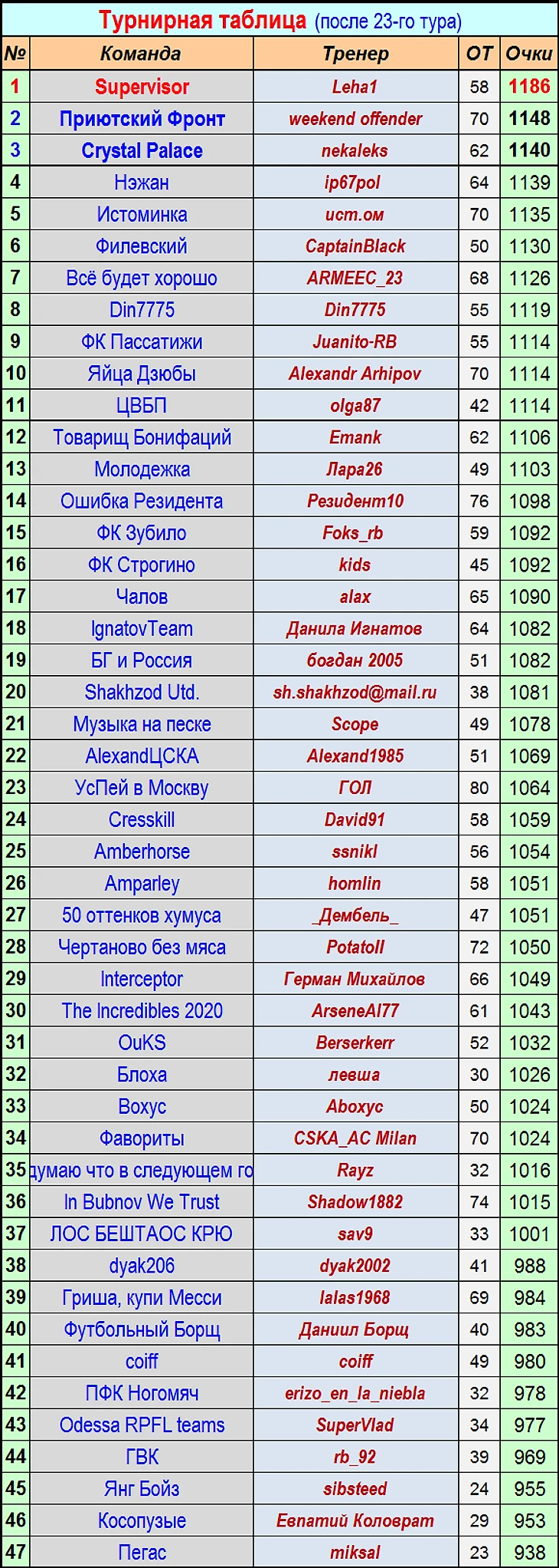 ЛИДЕР Чемпионата ФФ - команда "Supervisor" (тренер - Алексей Leha1) - 1186 очков!