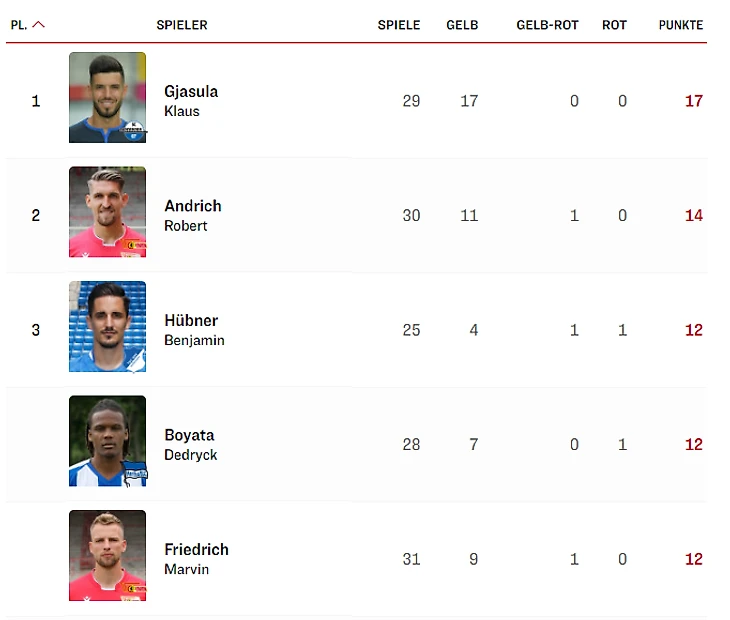 *игрок – кол-во игр – желтые – 1+1 желтые – красные – всего