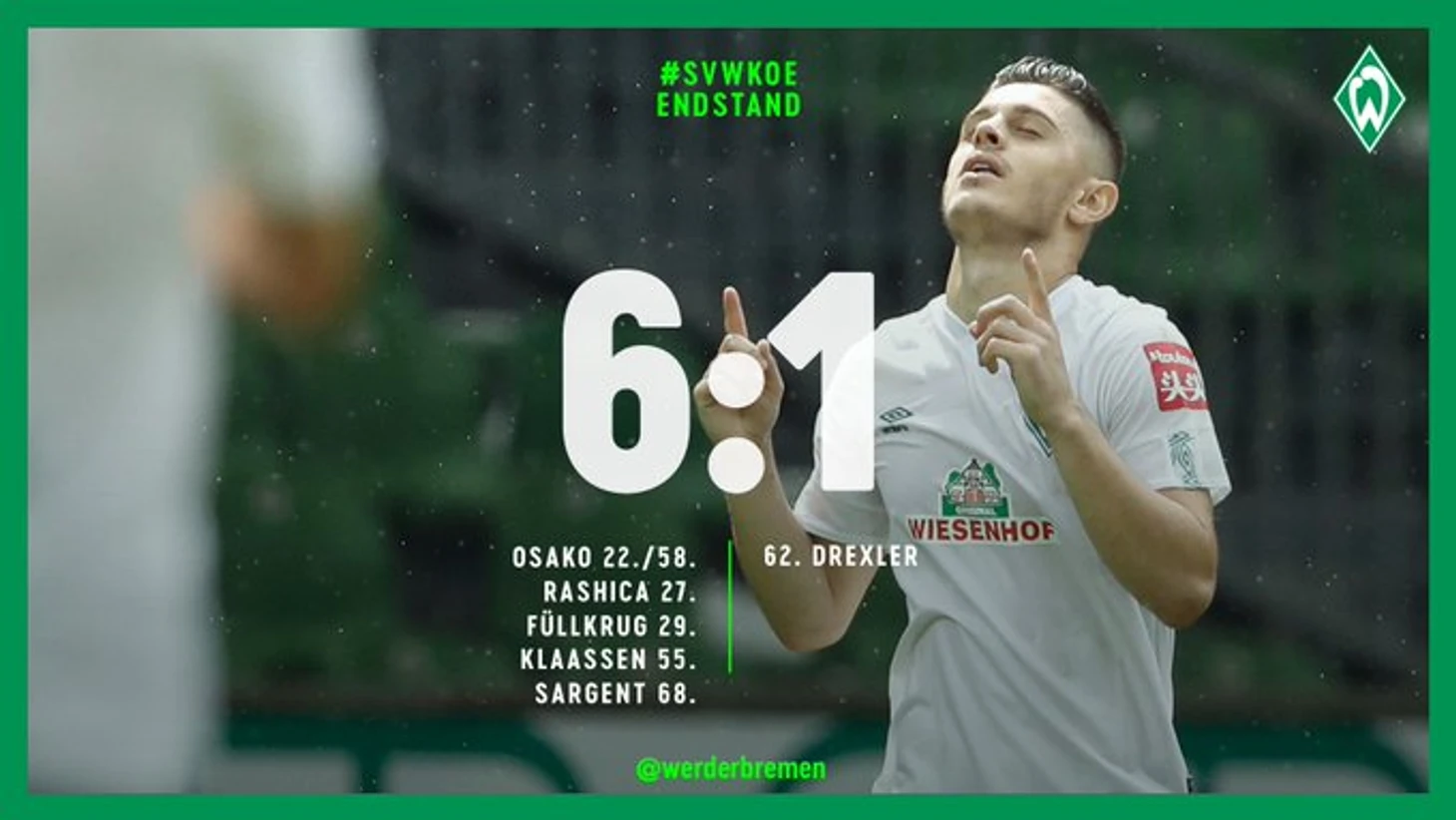 Игра началась обоюдными атаками, причем у «Вердера» настоящим лидером и заводилой был Рашица, который поспевал везде. В середине тайма хозяева поймали кураж и нанесли нокаутирующий удар, забив три гола за семь минут! С учетом гола «Униона» в параллельном матче скамейка «Вердера» находилась в радостно-нервическом возбуждении. Тем более, «Кельн» полез отыгрываться, оголив тылы (и без того не самые надежные) и в начале второго тайма получил еще 2 гола от Классена и Осако. Правда, тут же Рашица от избытка рвения отдал неудачный пас назад, выведя Дрекслера один на один с собственным вратарем. Но этот счет продержался минут шесть – неугомонный Рашица исправился, сохранив мяч в борьбе и выведя к воротам Сарджента - 6:1!