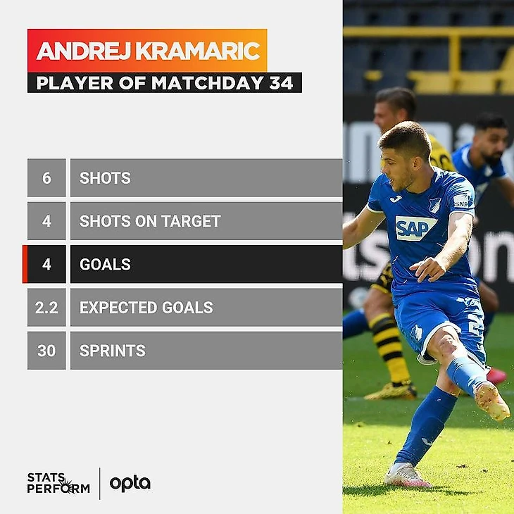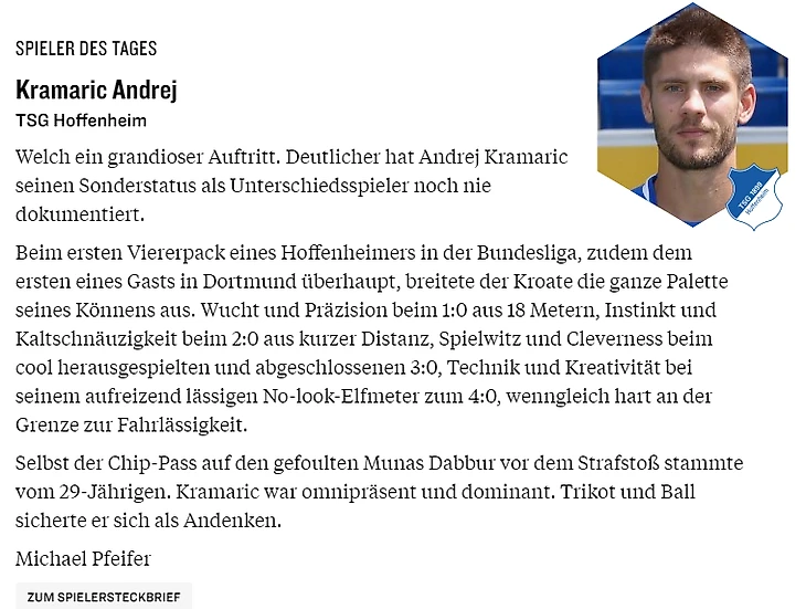 Андрей Крамарич стал первым игроком «Хоффенхайма», забившим 4 гола за матч в Бундеслиге, и первым игроком Бундеслиги, который забил покер в качестве гостя «Боруссии Дортмунд».