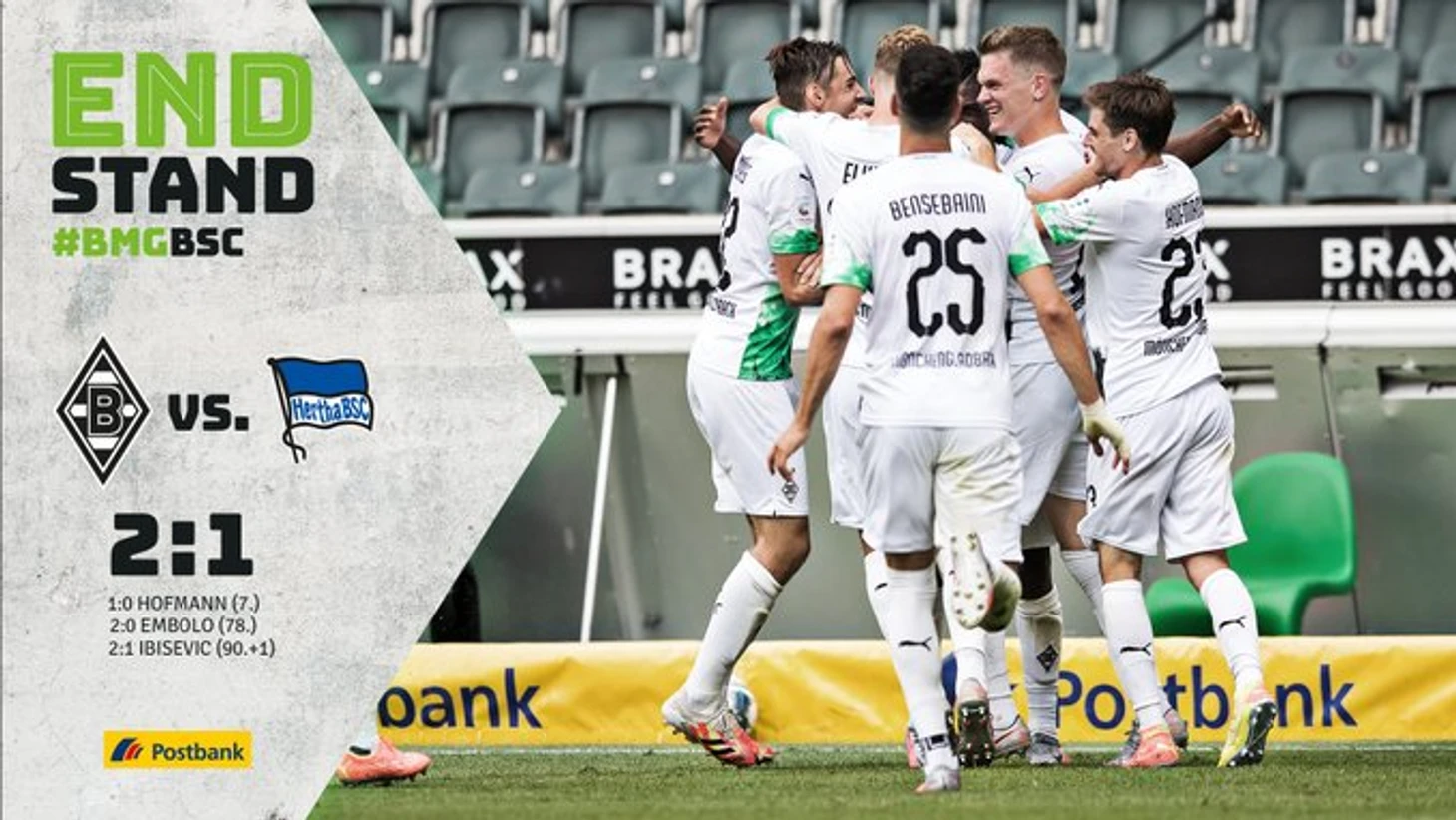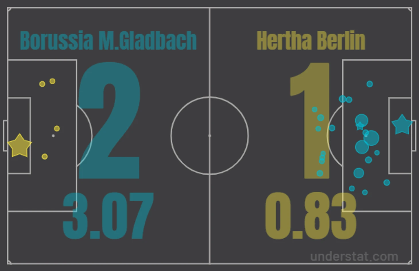 Счет был открыт уже в дебюте встречи, когда Эмболо непостижимым образом выцарапал мяч у защитников и вывел на удар Хоффмана. После этого хозяева продолжали владеть инициативой, но никак не могли забить. «Герта» не представляла серьезной угрозы, но любой случайный мяч мог перевернуть ситуацию. В отсутствии Плеа и Тюрама самым заметным был Эмболо, но ему никак не удавалось завершение. Только в концовке Хоффман отдал долг швейцарцу и вывел того на пустые ворота.
