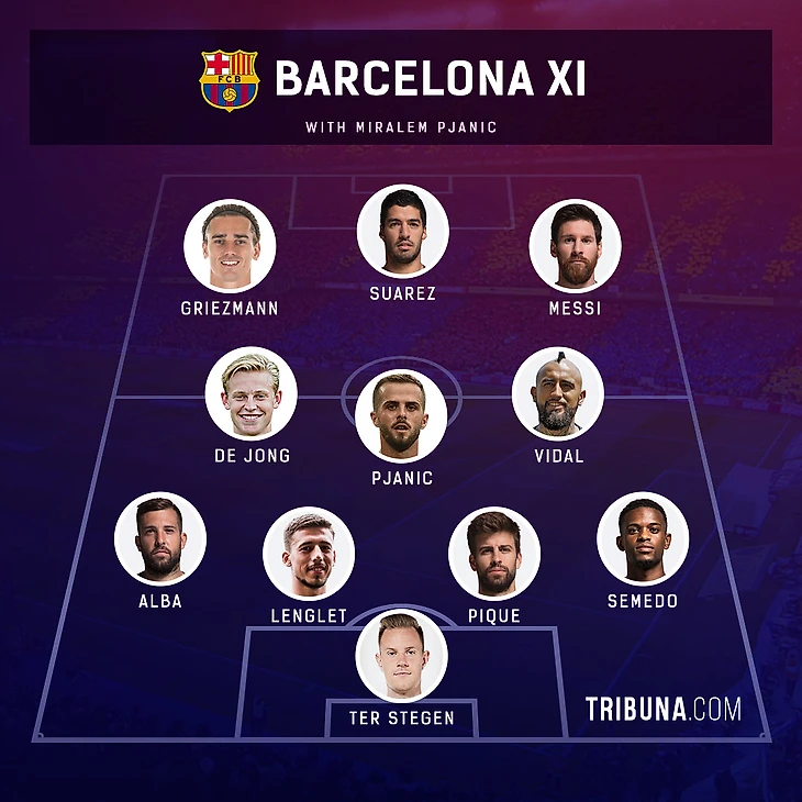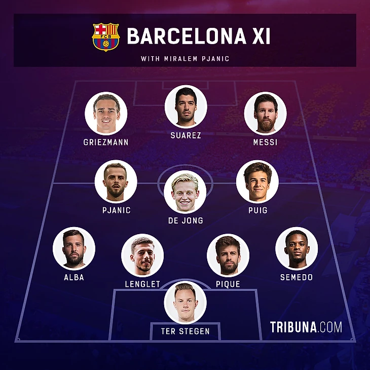 Это самый простой вариант - Миралем Пьянич занимает место Артура, а Серхио Бускетс и Френки де Йонг стартуют на своих обычных позициях.