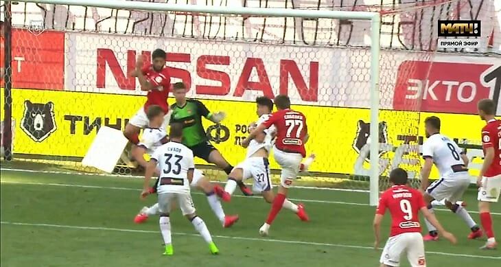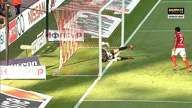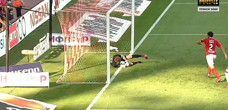 93-я минута. Из-за второго эпизода спорят намного жестче. «Спартак» заработал штрафной, мяч снова дошел до Соболева после сильного прострела, и форвард в касание пробил чуть левее Беленова. Вратарь эффектно нырнул и справился, но не крепко зафиксировал мяч, и сам завалился за линию. Игроки «Спартака» посчитали, что за линию завалился и мяч.