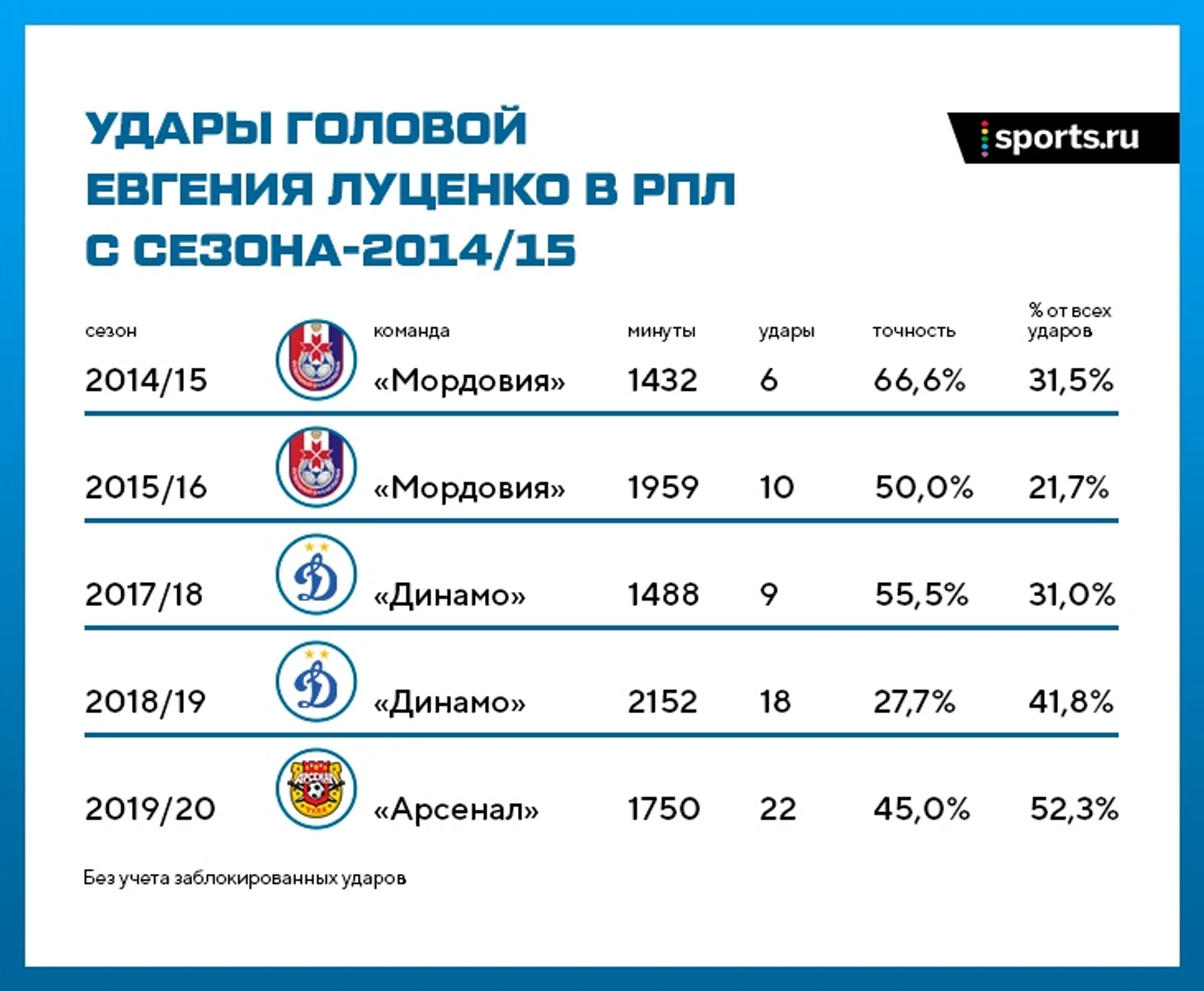 Очевидно, в «Арсенале» Луценко не стал лучше играть головой, а по проценту выигранных верховых единоборств он серьезно уступает Соболеву (44,6%), Деспотовичу (50%) и Дзюбе (59,5%). Более того, Евгений – даже не лидер РПЛ по числу ударов головой.