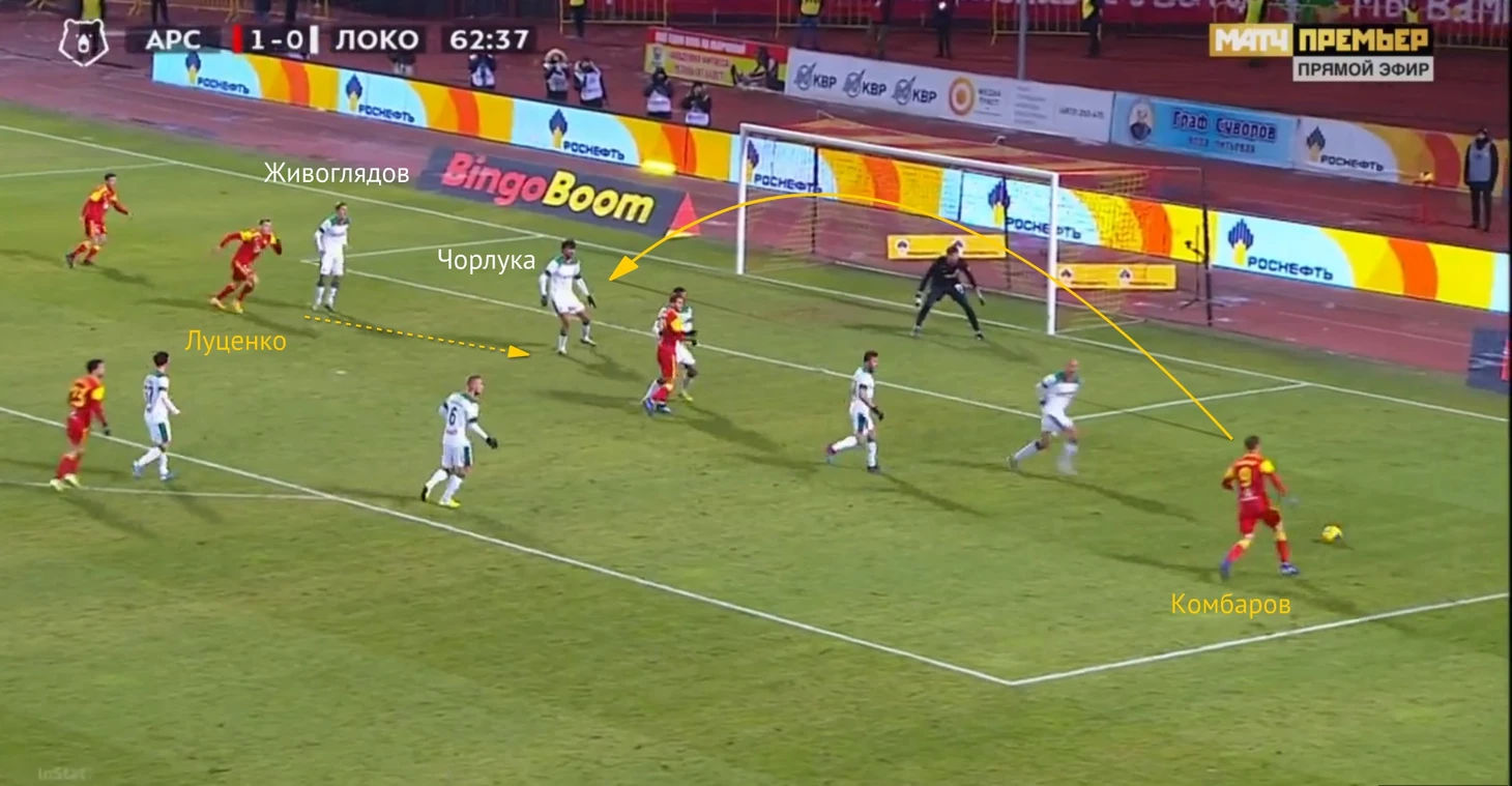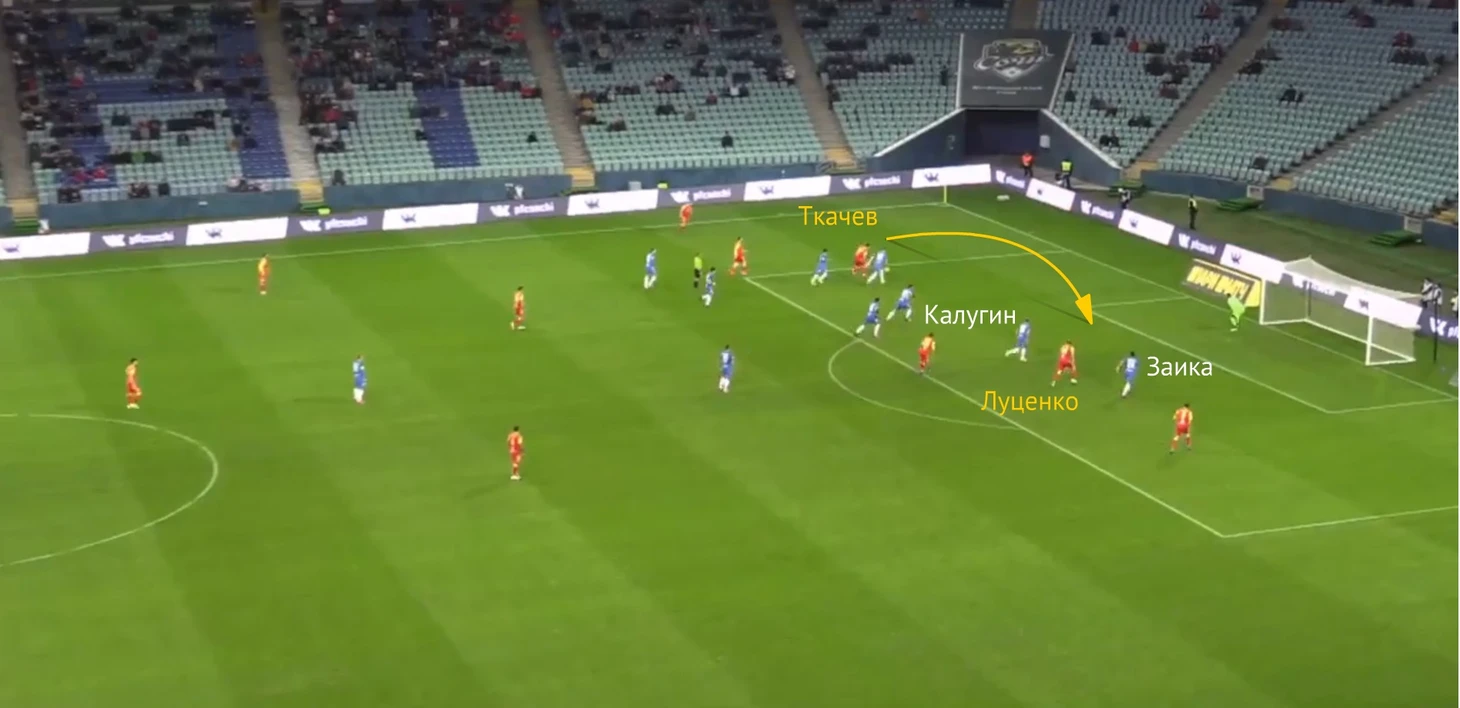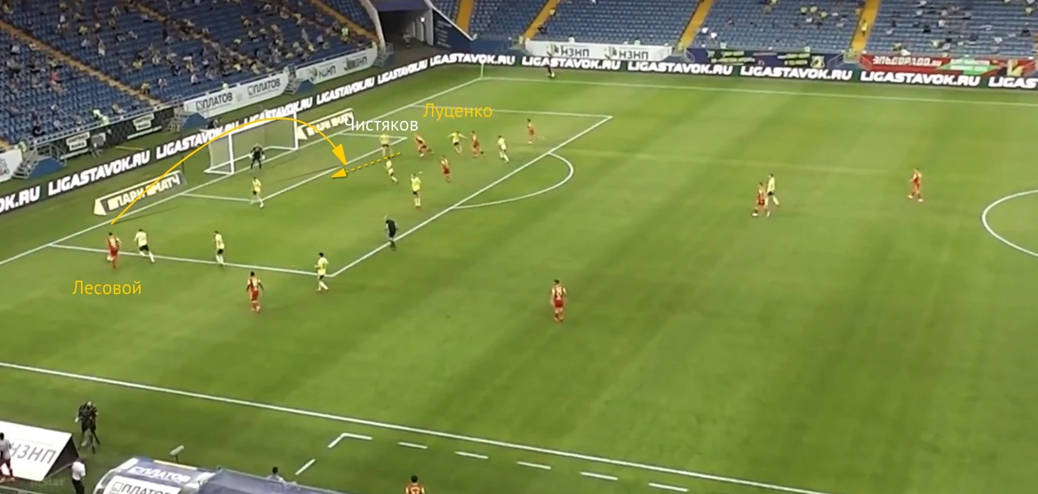 «Тамбову», «Сочи», «Локомотиву» и «Ростову» в гостях Луценко забивал, двигаясь к ближней штанге или центру вратарской в момент подачи (это точно наигрывается Черевченко на тренировках). Такой прием дезориентирует защитников – либо они не сами не успевают за открыванием Евгения (Калугин и Чистяков), либо отдают нападающего партнеру, который не ждет кого-то из-за спины (Живоглядов и Чорлука и отчасти Таказов с Ойеволе, хотя Адесойе видел забегание Луценко).