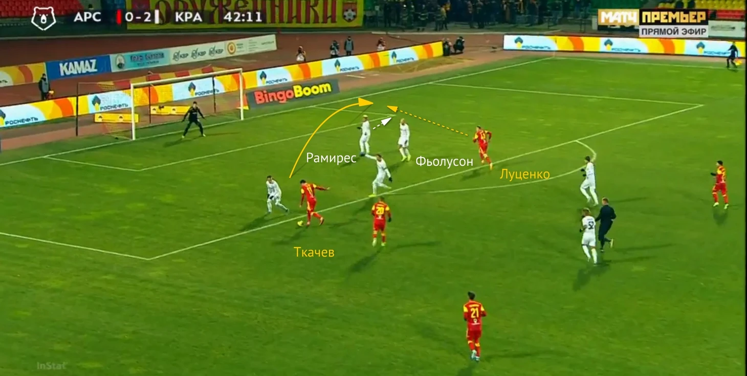 Голы «Краснодару» и «Сочи» – не только отражение координации Луценко (голы головой в падении), но и отличные примеры умного движения Евгения. Против «Краснодара» он набежал в зону между левым центральным защитником Фьолусоном и левым защитником Рамиресом.