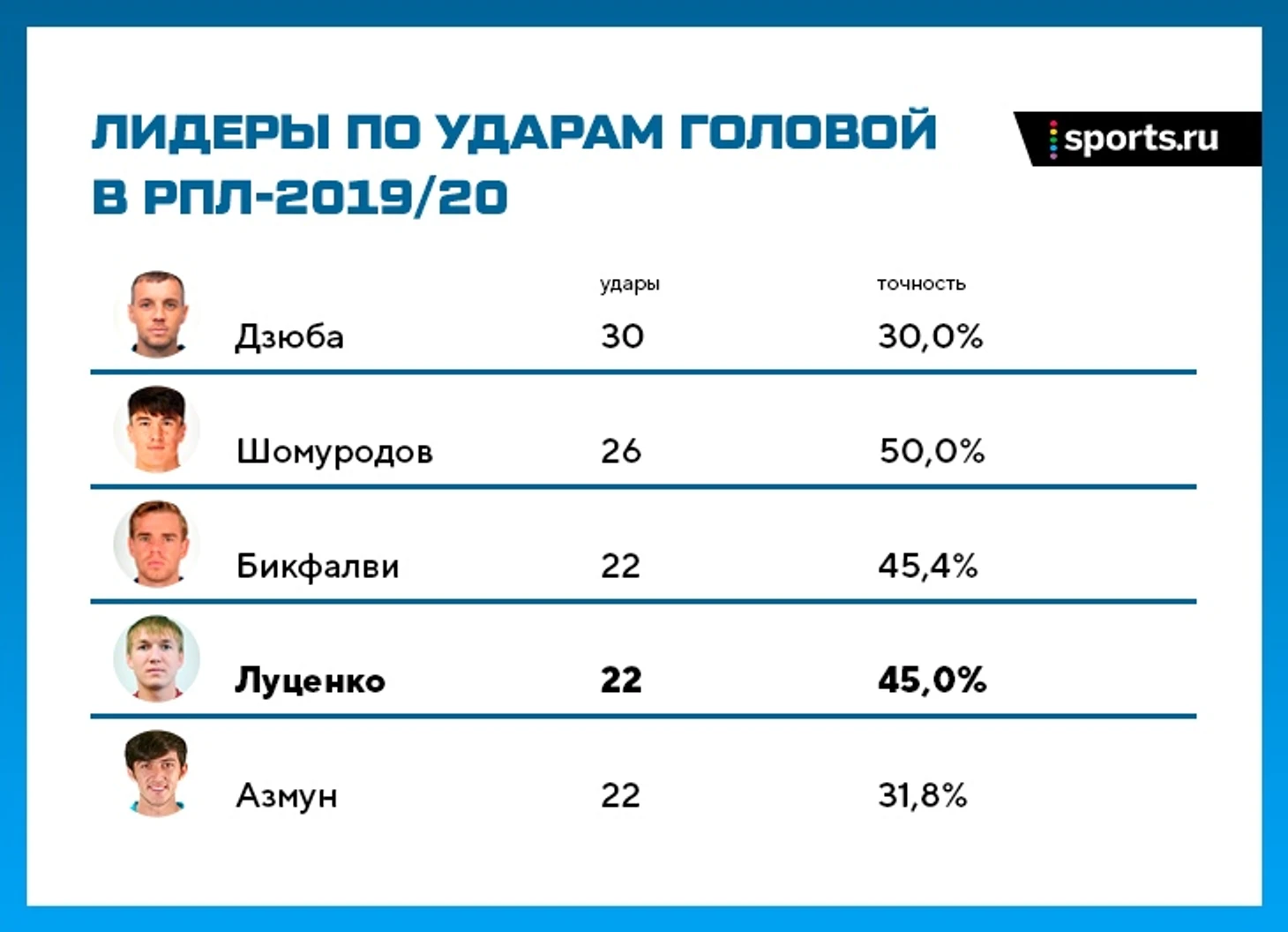 По количеству ударов головой (в том числе – в пересчете на 90 минут) и их доле от всех ударов этот сезон тоже рекордный для Луценко.