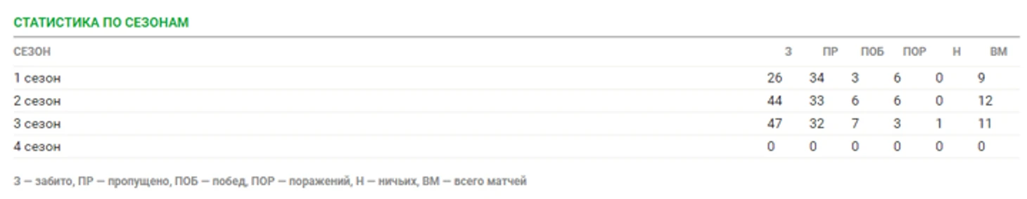 Также у нас представлена полная статистика по сезонам, в которой вы можете найти данные о забитых и пропущенных голах за сезон, о количестве побед и поражений, а также о количестве матчей в сезоне.