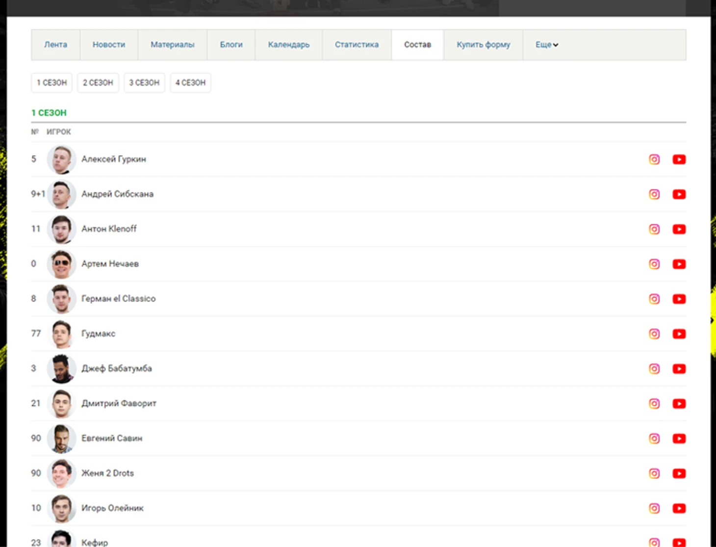 Вкладка «Состав» призвана помочь всем тем, кто не помнит, с какого сезона в команду пришел Чужой, и какой номер был у Нечая с самого начала. Здесь мы собрали всю информацию в рамках отдельных сезонов о номерах игроков, а также данные относительно их участия в сезоне. Ну и кнопочки с инстой и ютубчиком для «изи перехода» на месте.