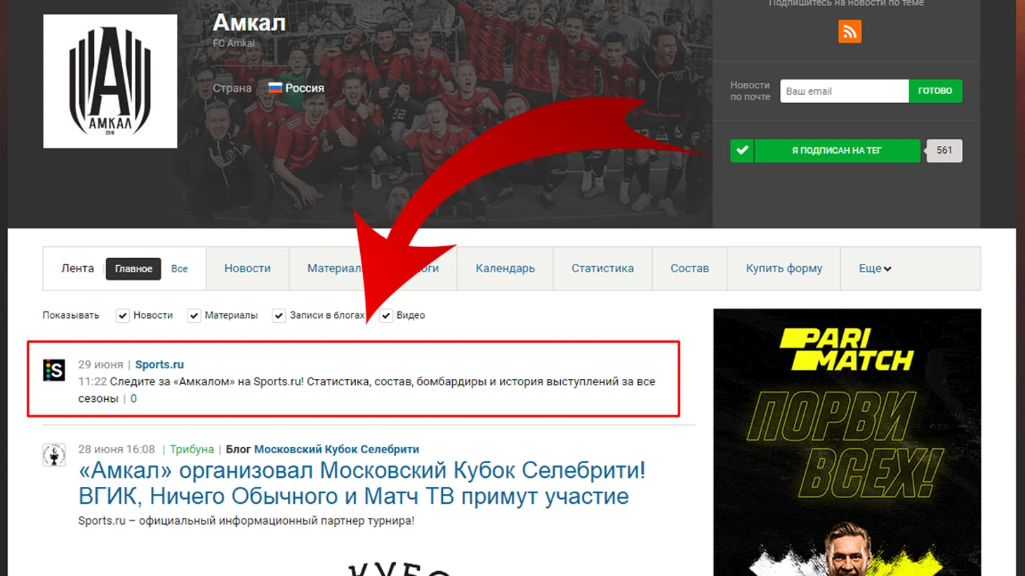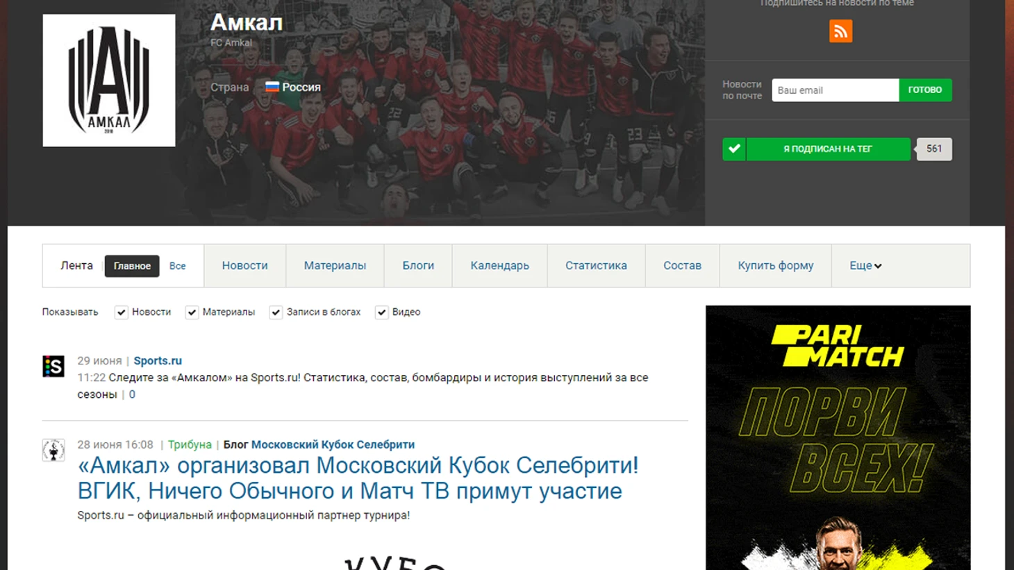 Тег – это своеобразный раздел сайта, где можно найти все новости / материалы / статистику, которые связаны с этим тегом. Чтобы попасть на страницу тега «Амкала» вам нужно вбить название команды в поисковую строку сайта или приложения и перейти по предложенному тегу «Амкал». У вас откроется страница, которая представлена на скриншоте выше, и вот тут то и начинается самое интересное. Дальше давайте рассмотрим все доступные вкладки тега по порядку.