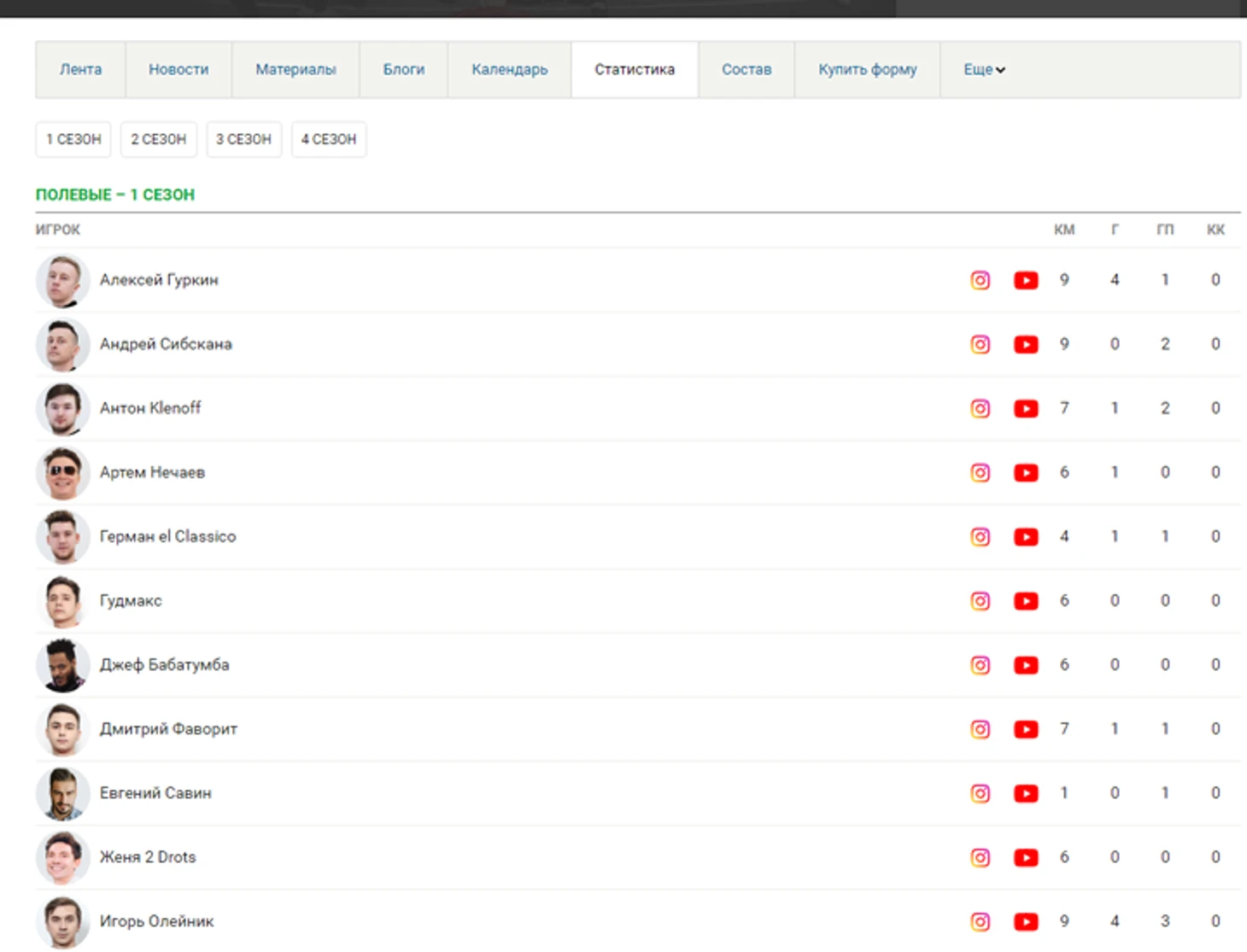 Вкладка «Статистика» наполнена данными о действиях каждого игрока команды в каждом отдельном сезоне. Опять же, вы можете ориентироваться по сезонам переключаясь между ними с помощью кнопок (1 сезон, 2 сезон, 3 сезон, 4 сезон). По каждому игроку в рамках отдельного сезона собрана информация о количестве проведенных матчей, забитых голах, ассистах, а также красных карточках. Отдельного внимания заслуживают кнопочки, которые автоматически перенесут вас в инстаграм или ютуб выбранного игрока, где вы сможете более подробно ознакомиться с его творчеством.