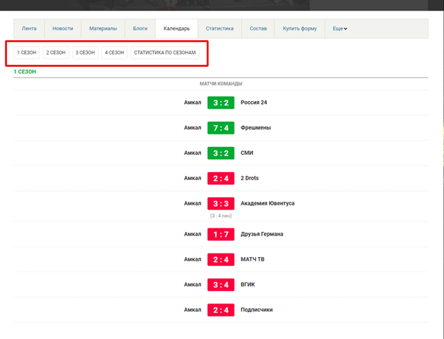 В самом календаре представлены все результаты всех матчей «Амкала» за всю историю существования клуба (предсезонные игры не в счет). Для удобства матчи разделены по сезонам, а в информационном табло вы сможете увидеть команду соперника, точный счет, а также счет в серии пенальти, если таковая была. Вы можете ориентироваться по сезонам переключаясь между ними с помощью кнопок, которые выделены красным на скриншоте выше.