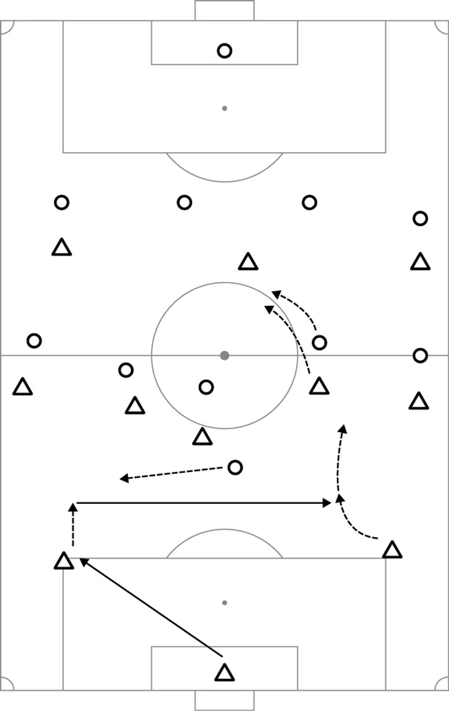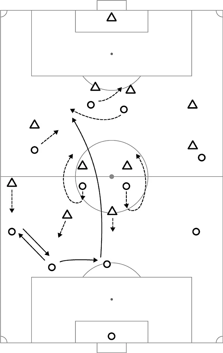 Чтобы достичь численного преимущества в центре поля, можно либо выдвинуть вперед защитника, либо отодвинуть нападающего. Это создает пространство в атаке для набегающих игроков.