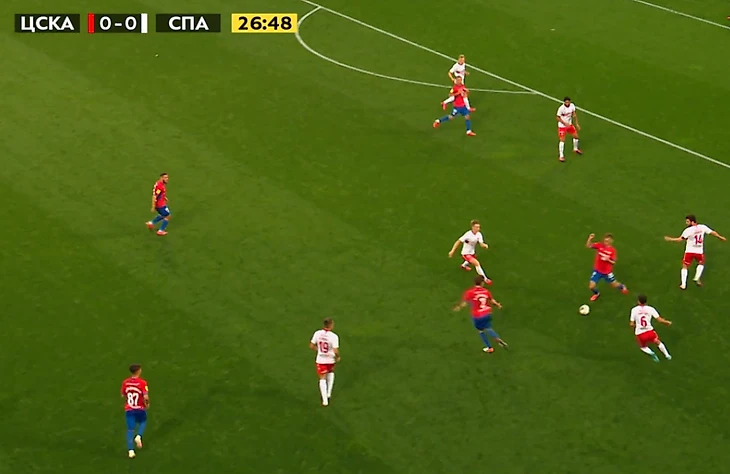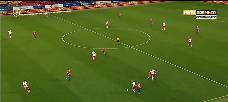 Как гости стали играть дальше? Пару защитников организовали Жиго и Джикия, а Павел Маслов понялся намного выше, к Зобнину. Идея та же, что и в первом тайме: создать численное преимущество на фланге Кирилла Набабкина, ведь теперь там были и Зобнин, и Маслов, и свежий Ларссон. Ситуативно "Спартак" мог получить ситуацию 3 против 2. По итогу реальных дивидендов это не принесло, но зато были созданы сразу несколько моментов, не сказать, что убойных, но тем не менее.