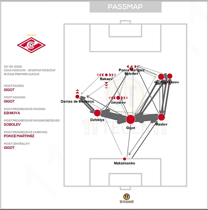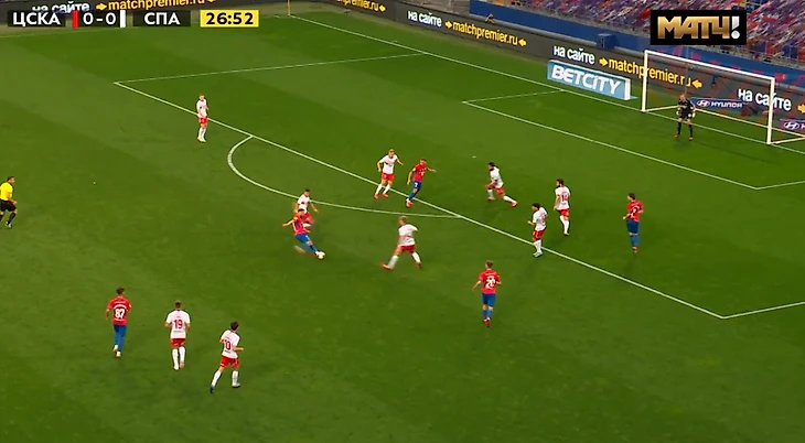Интересное наблюдение: ЦСКА не играл в атаку левым флангом. Причина проста: нежелание получать контратаку, ведь тогда "Спартак" получал преимущество в лице вышеупомянутых Зобнина и Рассказова.