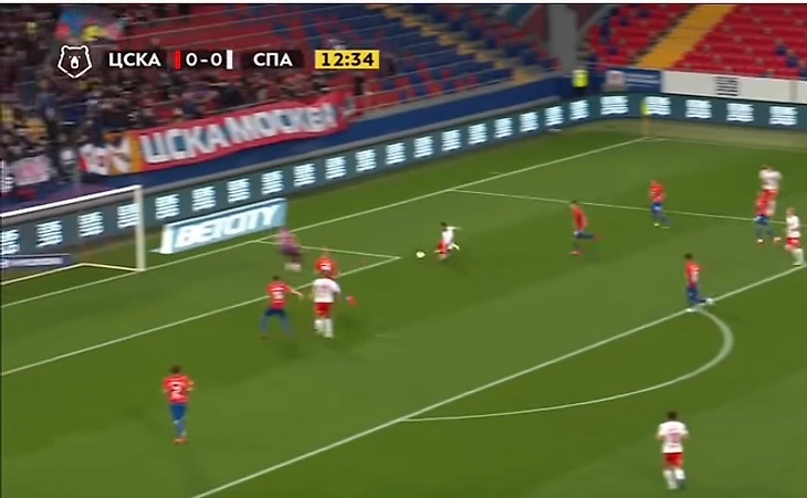 Напомню: Умяров в центре один, ведь Зобнин справа... Однако Роман успевает вернуться, но накрыть удар не успевает ни он, ни кто-либо еще. Так ЦСКА вышел вперед.