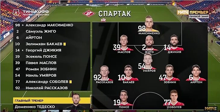2) Стартовый свисток. "Спартак" прогнозируемо начал играть флангами. Замысел Тедеско мне видится следующим образом: справа Рассказов и Зобнин должны были играть против немолодого Щенникова (который к тому же был лишен определенного игрового тонуса). Это подтверждается цифрами: