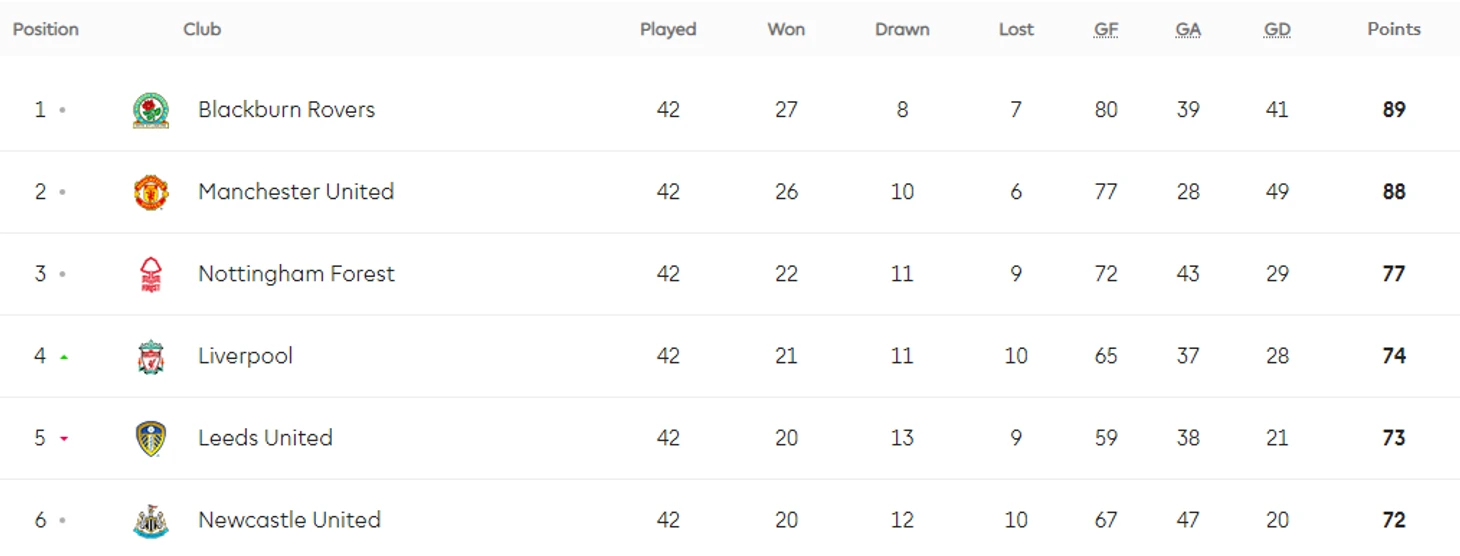 «Блэкберн» опередил «Юнайтед» всего на один балл, забил 80 голов, что на 3 больше, чем у коллектива Фергюссона. Наколотив 34 мяча Алан Ширер уверенно стал лучшим бомбардиром, Робби Фаулер («Ливерпуль») остался в пыли с 25 голами, хотя справедливости ради, Фаулеру было всего 19 лет. Также Ширер записал 13 голевых передач в свой актив и занял третью строчку, уступив Мэтью Лэ Тисьэ («Саутгемптон», 15 передач) и Даррену Андертону («Тоттенхэм», 14 передач).