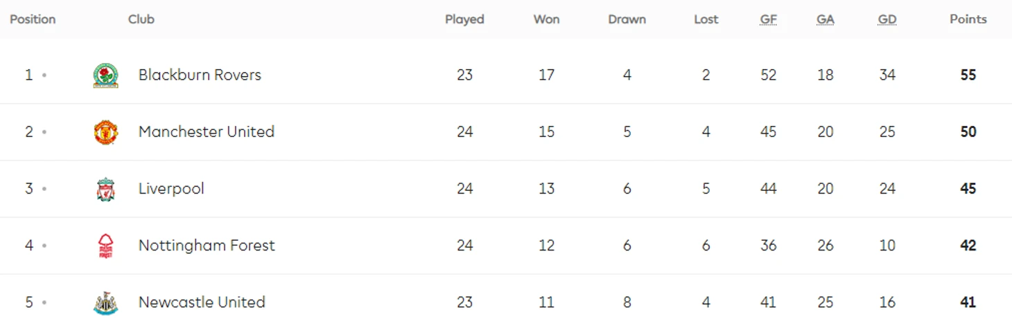 В старте сезона мощно начал «Ньюкасл Юнайтед». Эндрю Коул, Руэл Фокс, Роберт Ли, Стив Бэрдсли и Стив Уотсон уверенно держали «сорок» лидерами чемпионата, пока в 15 туре они не проиграли на выезде «Уимблдону» с Винни Джонсом, который кстати матч не доиграл из-за красной карточки. Тогда на первую строчку вырвался «Манчестер Юнайтед», а вот «Блэкберн» сравнялся с «сороками» по очкам, но превосходил их по разнице забитых мячей.
