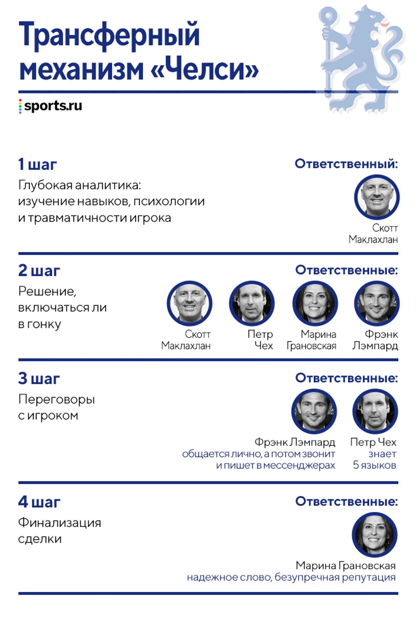 Поведение «Челси» на рынке определяет именно эта четверка. Маклахлан оценивает уровень игрока, выносит личный вердикт и делает все для того, чтобы итоговое решение было максимально обоснованным. Грановская и Чех тоже имеют право голоса, но по-настоящему включаются в дело чуть позже. Лэмпард ставит точку: нужен игрок или нет.